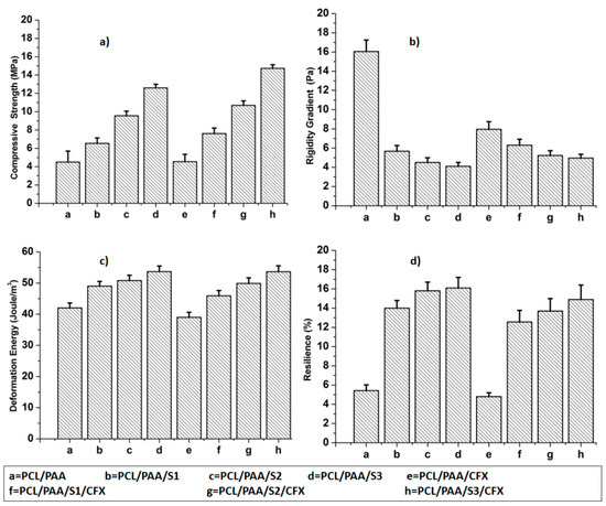 Figure 4 represents the mechanical properties of the PCL/PAA scaffolds before and after silica microspheres and CFX loading with reference to the native PCL/PAA scaffold. The CS, DE and MR (%) of all the investigated scaffolds increased compared with the native PCL/PAA blend scaffold, as shown in Figure 4a,c,d. In particular, the CS, DE and MR (%) increased from 4.5 ± 0.9 MPa, 42.0 ± 0.2 Joule/m3 and 5.42% ± 1.2% (PCL/PAA scaffold) to 14.73 ± 1.1 MPa, 53.65 ± 0.4 Joule/m3 and 14.90% ± 1.2% (PCL/PAA/S3/CFX scaffold), respectively. In contrast, the RG of the silica microspheres-loaded scaffolds decreased compared with the native PCL/PAA scaffold, as shown in Figure 4b. These results are attributed to the clear porosity (%) decrement of the silica microspheres-loaded blend scaffolds and supported by the fact that silica microspheres are considered as inorganic filler [9,21]. In fact, such a decrease has not been recognized for PCL/PAA blend scaffolds since the structure is initially porous (Figure 1a). Implanted scaffolds in load-bearing bone should possess properties of adequate porosity and mechanical properties to bear the applied in vivo load and to prevent new tissue damage [22]. The CS for the silica microspheres and CFX loaded scaffolds of ˃14 Mpa is applicable for bone tissue engineering. However, a range of values is typically considered appropriate due to differences in cortical and trabecular bone structure [23].