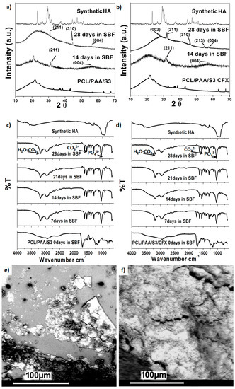 The in vitro bioactivity of the scaffolds was assessed by means of XRD, FTIR and SEM after immersion of scaffolds in SBF for varying time intervals. XRD analysis and FTIR spectra before and after immersion in SBF compared with synthetic hydroxyapatite (HA) are represented in Figure 5a–d. Based on the physicochemical and physicomechanical studies, PCL/PAA/S3 and PCL/PAA/S3/CFX scaffolds were selected to be investigated after immersion in SBF. These scaffolds showed a remarkable change after immersion in SBF due to degradation of the PCL/PAA blends scaffolds. However, the degradation products of PCL and PAA are a naturally occurring metabolite in the human body [1,24]. The XRD pattern for the Si-loaded scaffold as well as CFX-loaded scaffold showed amorphous calcium phosphate precipitations after 14 days of immersion in SBF, as confirmed by the presence of the following peaks that were observed at 32° (211), and 53° (004). After 28 days of immersion in SBF, the calcium phosphate layers precipitated on the surface of these scaffolds were more crystallized, as affirmed by the following peaks that were observed at 32° (211), 40° (310), 50° (213) and 53° (004), as earlier reported for organic scaffold loaded with in organic filler [25,26]. However, the PCL/PAA/S3/CFX scaffold showed relatively higher bioactivity than the PCL/PAA/S3/scaffold as confirmed by presence of peak at 28° (002),which is attributed for HA.