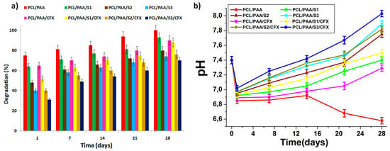The biodegradation and pH measurements were conducted over a period of 28 days while the scaffolds were incubated in SBF under the same conditions of the biomineralization experiment. Figure 6 represents the biodegradation (%) and the SBF pH variations of the investigated scaffolds. A significant decrease in SBF pH values was observed at the initial stage after immersing the scaffolds in SBF. This phenomenon was caused by the direct degradation of the PCL/PAA scaffolds to PCL and PAA acidic degradation products, as reported previously [29,30]. This decrease occurs after 2 days of immersion in SBF. In particular, after 2–7 days, a noticeable decrease in pH (from 7.4 to 6.8) was observed, combined with a rapid scaffold biodegradation rate (35%–75%). It is highlighted that the biodegradation rate of the silica microspheres and CFX-loaded scaffolds were slower than the silica microspheres and CFX-free scaffolds. These results are obtained due to the fact that released silica microspheres and CFX stabilized and compensated for the effect of the PCL/PAA acidic degradation products, which in turn stabilized SBF pH.