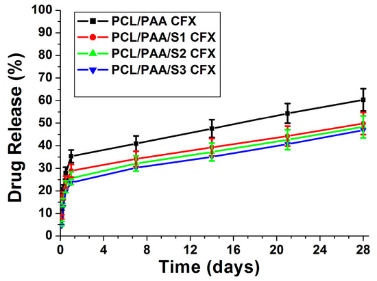 In order to investigate the effect of silica microspheres loading on the CFX release behavior, in vitro drug release studies were conducted for all CFX-loaded scaffolds in PBS, as shown in Figure 7. Generally, all scaffolds released 30% of CFX after 1 day and, thereafter, the release pattern followed linear behavior up to Day 28. The CFX release from both silica microspheres-loaded and silica microspheres-free scaffolds was relatively identical, except that the initial burst phase from the silica microspheres-loaded scaffolds was slightly reduced (20%), and the corresponding release rates were clearly down-regulated by the presence of silica microspheres. These results are due to the fact that CFX was incorporated into the PCL/PAA scaffold matrix through physical blending, as confirmed by SEM images Figure 1g–j. Therefore, the CFX was superficially adsorbed onto the silica microspheres-free scaffold matrices. Once exposed to PBS media, the physical attachment between CFX and the scaffold matrix was easily disentangled due to the hydrophilicity of both PAA and CFX, leading to a significant initial release phase, followed by linear behavior up to Day 28. In contrast, the presence of silica microspheres formed hydrogen bonding with CFX, which relatively decreased the burst effect of CFX from the silica microspheres-loaded scaffolds. These results were consistent with earlier reported results for sustained drug release from multi-phase blend scaffolds [35,36,37,38,39]. In summary, the higher quantities of silica microspheres regulated the release profiles of CFX from the scaffolds. Based on the results illustrated in Figure 7, and correlating this with the microstructure properties of the scaffolds, it can be deduced that higher silica microspheres concentrations (30 mol %) are recommended for a sustained and prolonged CFX release due to their relatively low porosity compared with the low silica microspheres concentrations (0 and 10 mol %).