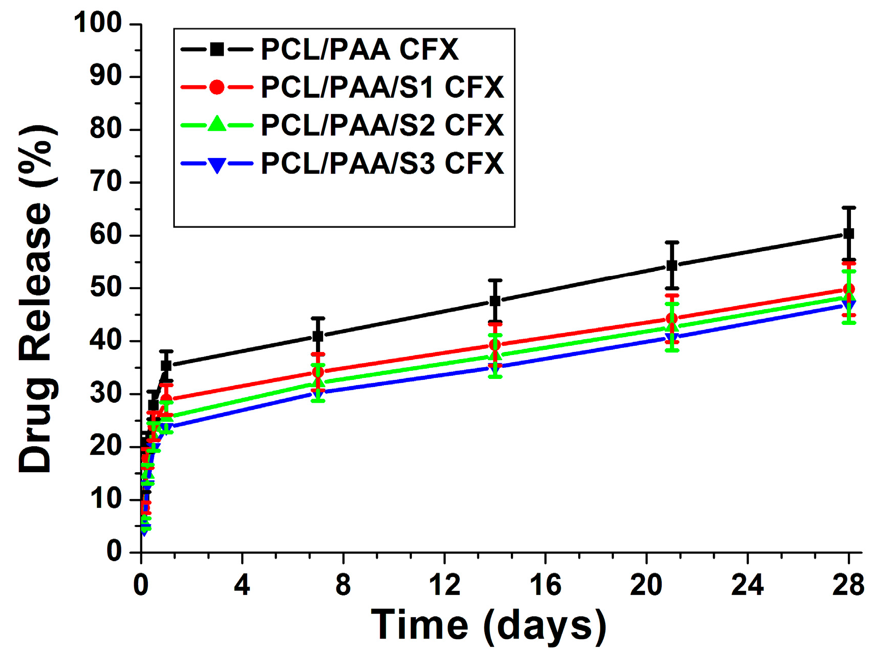 To determine the release behavior of CFX form the PCL/PAA blend scaffold, in vitro release studies were undertaken in PBS (pH 7.4; 37 °C): 100 mL of PBS, previously heated at 37 °C, was added to glass vessels maintained at 37 °C within a shaking incubator (50 oscillations·min−1). At predetermined time intervals, 1 mL samples of the release medium were withdrawn and the CFX concentration was determined spectrophotometrically at 277 nm using UV-Vis spectroscopy (Lambda 25 UV/Vis Spectrophotometer, PerkinElmer, Waltham, MA, USA). Before analysis, the samples were filtered and diluted with PBS. The withdrawn samples were replaced with drug-free PBS in order to maintain sink conditions. CFX release was monitored over 28 days and all experiments were performed in triplicate (N = 3). CFX is well known to be highly effective against Gram positive and negative bacteria, therefore, an antibacterial test was not necessary.