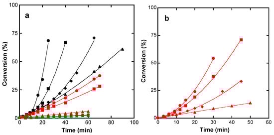 For both double-charged monomers, increase of the slope with polymerization time is visible in Figure 2a,b for higher initial monomer concentrations, reflecting the increase of RP. Contrary, the polymerization rate of Q9 follows the behavior expected for free radical FRP (Figure 2c), the slope of the conversion curves is constant or decreases with time due to reduction of the monomer and initiator concentrations.