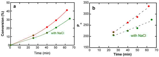 Figure 4 illustrates the comparison of di-M polymerizations without and with addition of NaCl. Both conversion and Pn reduced upon addition of low molar mass salt.