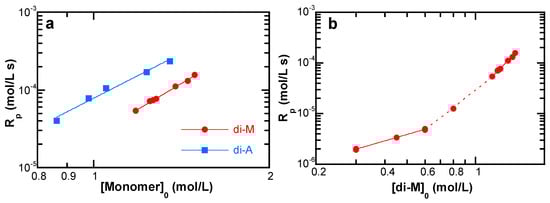 The strong and non-ideal influence of the initial di-M concentration on the polymerization rate, which according to Equation (2) lead to α = 4.40 ± 0.16 for a confidence interval of 95% [21], was confirmed by more experiments (Series 5, Table 1). In addition, α = 3.50 ± 0.10 (Series 6, Table 1) was calculated for di-A for the same confidence interval (Figure 5a).