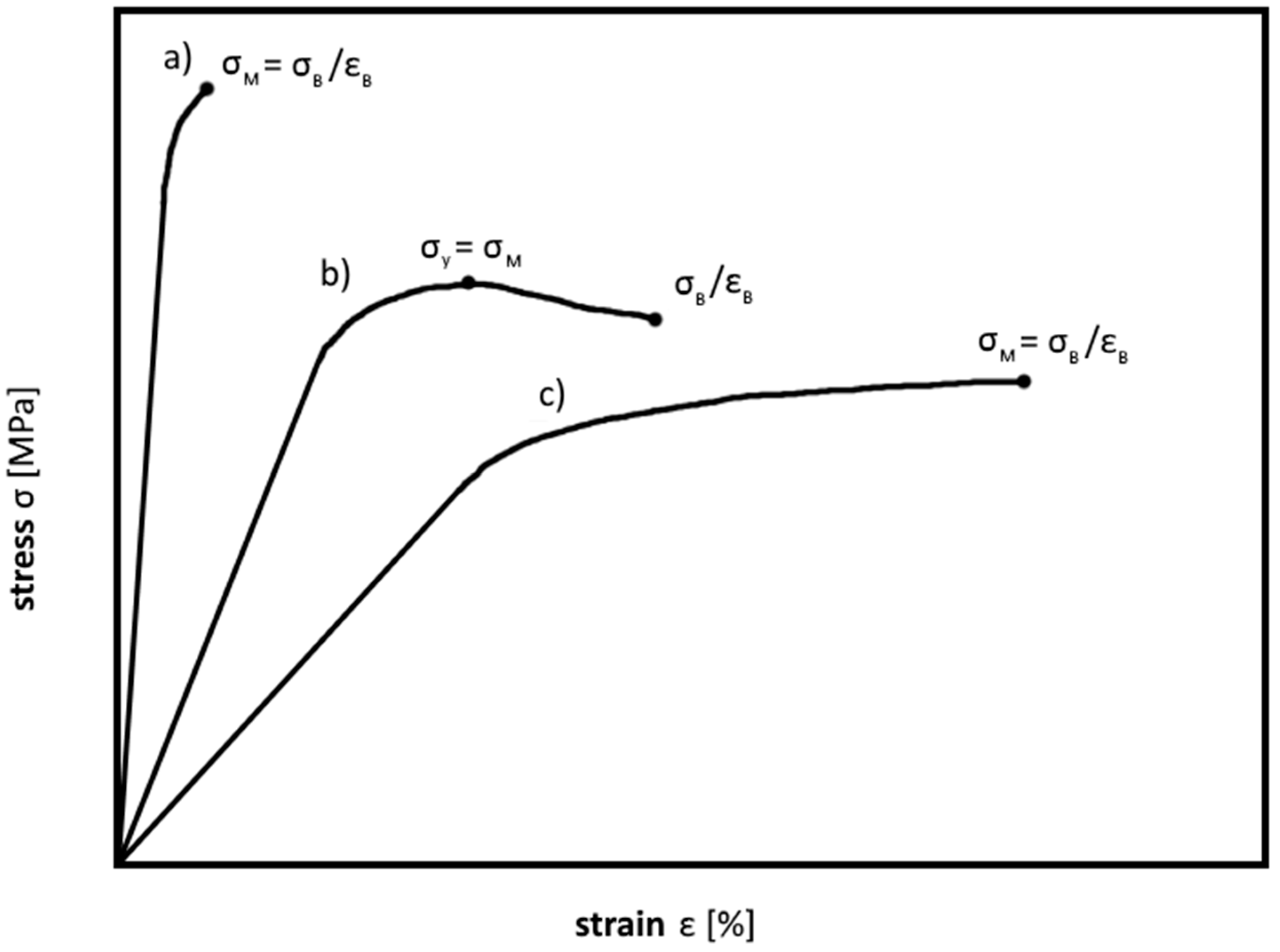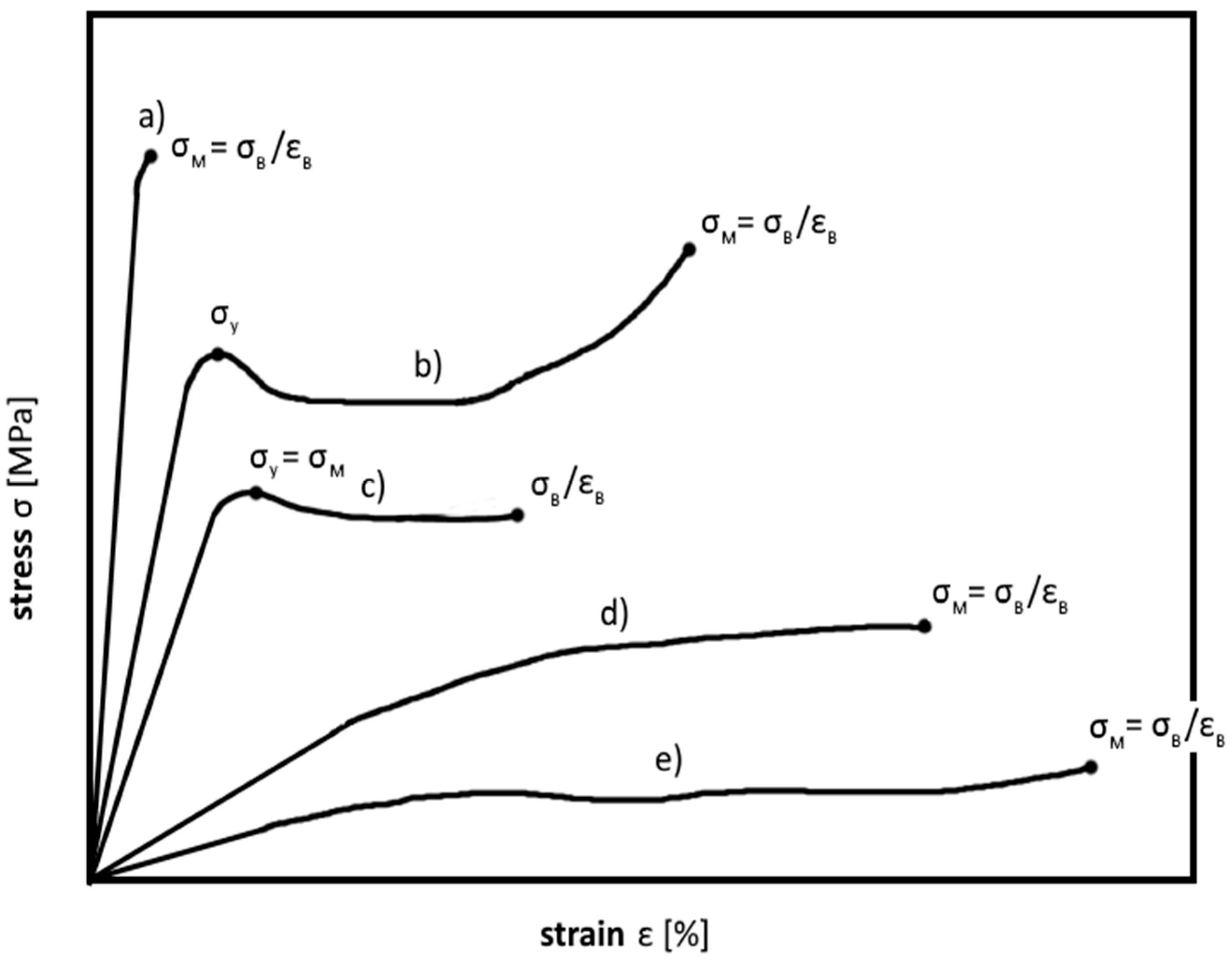 Stress–strain curves of various polymeric materials, (a) brittle materials; (b,c) tough materials with yield point; (d) tough material without yield point and (e) elastomeric materials.