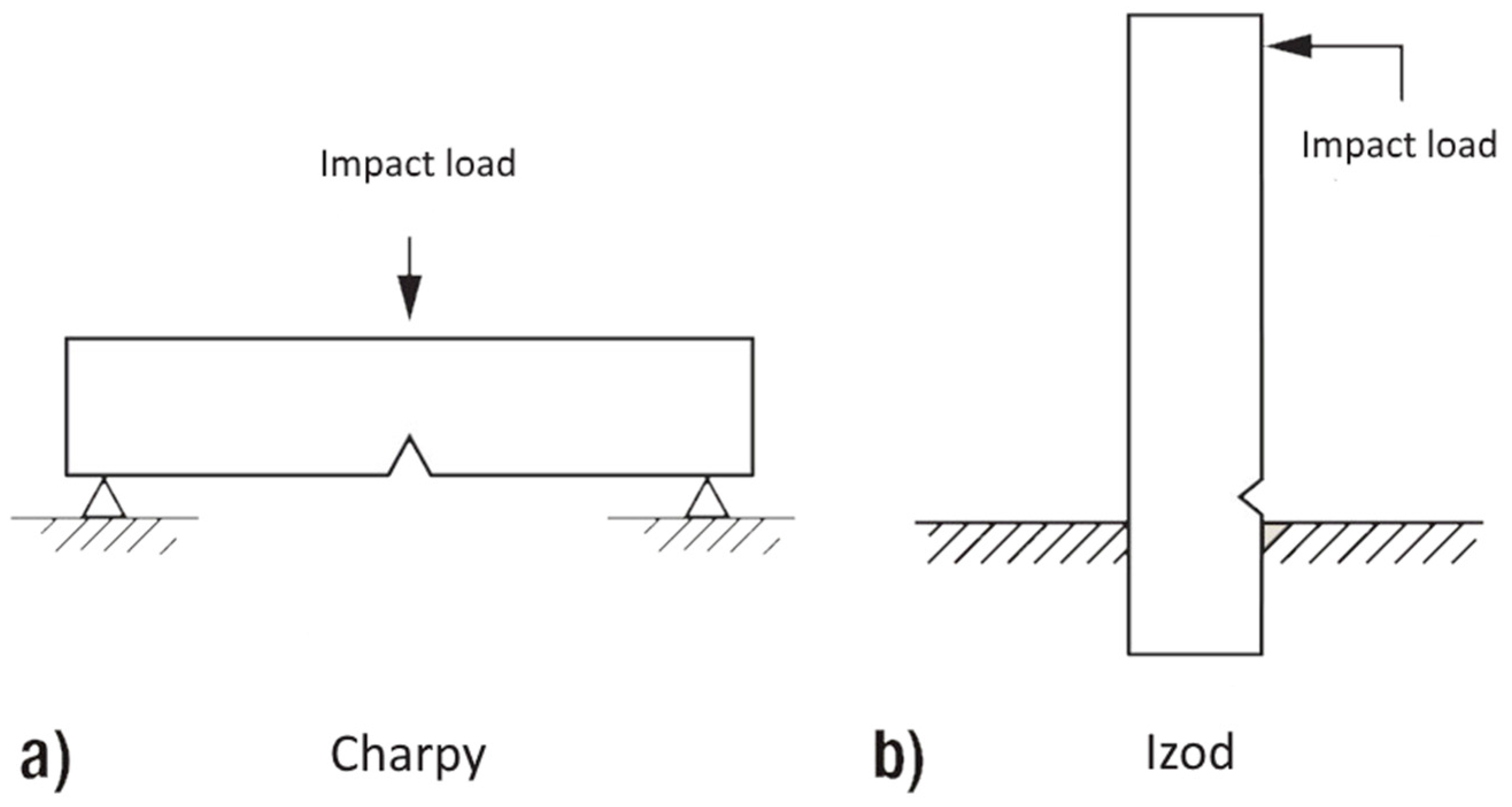 In many applications thermosets have to withstand impact load due to environmental or application influences. Even a very small amount of impact energy could seriously reduce the static strength of materials, decreasing component reliability; any attempt to improve the tensile property would lead to a decrease of impact property at the same time. The impact toughness can be determined by measuring the needed energy to break a standard specimen, which is one of the most common methods to evaluate impact properties. Charpy (simple supported beam load; Figure 7a) and Izod (cantilever beam load; Figure 7b) impact tests were developed for isotropic materials [25]. To determine the Charpy impact strength of an unnotched specimen (acU), the energy (Wc) absorbed by breaking the specimen is related to the initial cross-section area of the specimen: