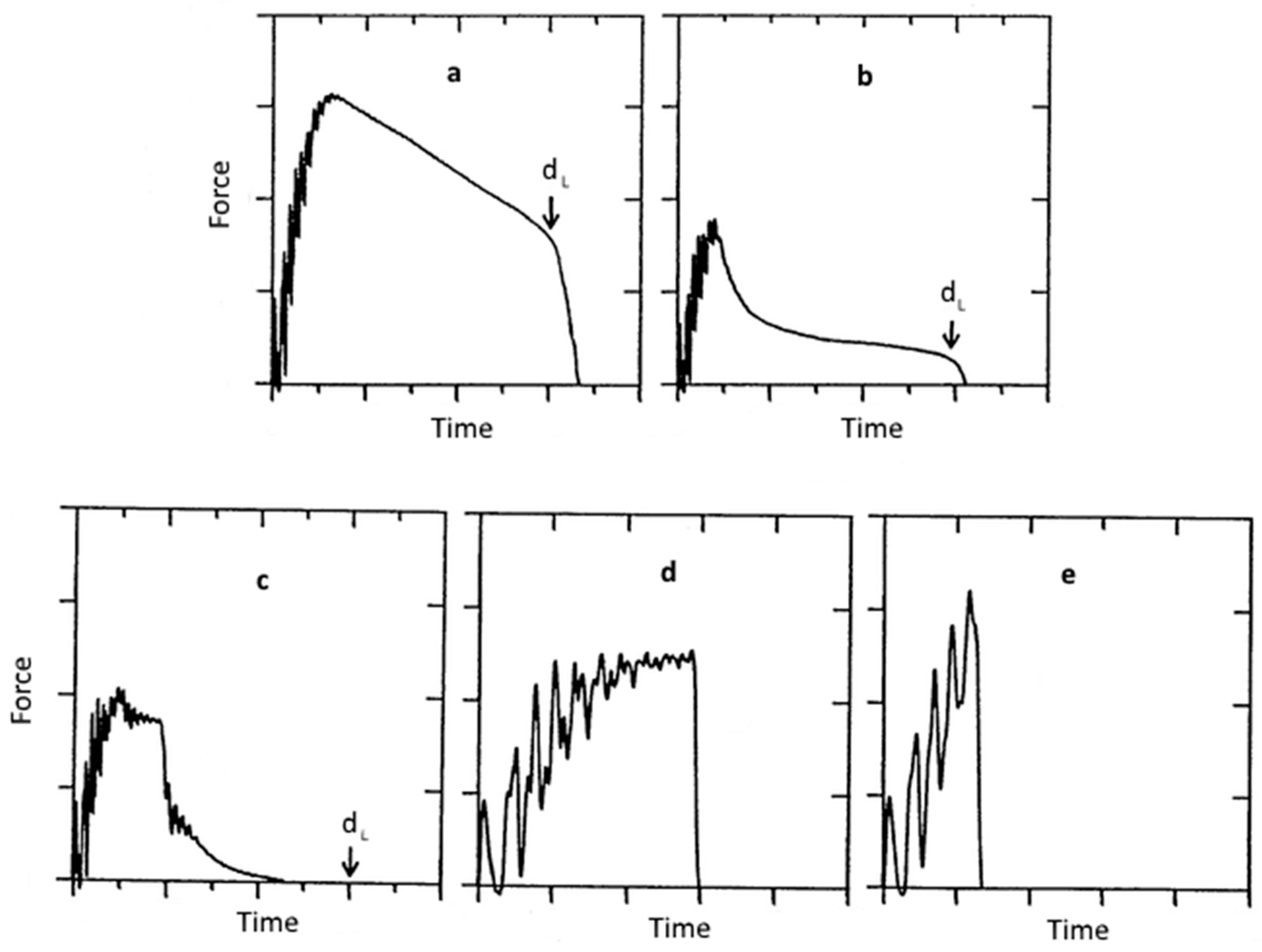 Types of failure modes in impact tests: (a) no break: yielding followed by plastic deformation till deflection limit dL; (b) partial break: additional yielding and stable crack growth till deflection limit dL; (c) tough break: yielding and stable crack growth till total failure; (d) brittle break: yielding followed by unstable crack growth; (e) splintering break: unstable cracking followed by yielding.