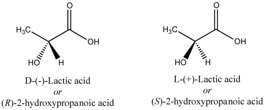 Among the biodegradable polymers, poly(lactic acid) (PLA) is the one of the most important. PLA has been extensively studied for a wide range of applications covering disposable household items, food packaging, agricultural films, drug delivery systems, and implantable biomedical devices [110]. There has been an abundance of literature in recent years related to the production of lactic acid and PLA. There have been recent reviews on lactic acid related to production of lactic acid from lignocellulose [111] production by fermentation processes [112], and lactic acid as a platform chemical for chemical synthesis [113]. For PLA, there have been many reviews of processing technologies [114], with some focused specifically on PLA foaming [115], PLA crystallization [116], and PLA-based nanocomposites [117]. Lactic acid (2-hydroxypropanoic acid) has two optically active configurations lactic acid (l-(+)-lactic acid and d-(−)-lactic acid), as shown in Figure 1 [118]. Both l- and d-enantiomers are produced naturally [119].