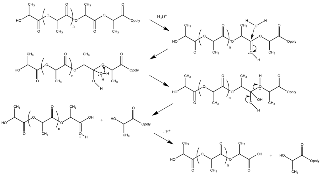 The reaction mechanism for the hydrolysis of polyesters is bimolecular nucleophilic substitution reaction (SN2), which may be catalyzed with either acids or bases [129]. A schematic of acid-catalyzed hydrolytic cleavage of PLA chains is shown in Figure 2 [124]. Furthermore, the reaction rates for hydrolytic degradation are dependent on a number of factors including: temperature [130], size and shape of samples [131], molecular weight [129], crystallinity [132], and relative humidity [133].