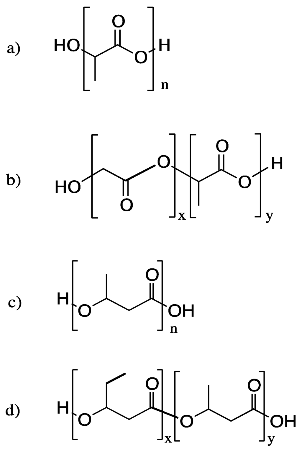 Chemical structures of (a) poly(lactic acid) (PLA); (b) poly(lactic-co-glycolic acid) (PLGA); (c) poly-3-hydroxybutyrate (or poly-hydroxybutyric acid, PHB); (d) poly(3-hydroxybutyrate-co-3-hydroxyvalerate) (PHBV).