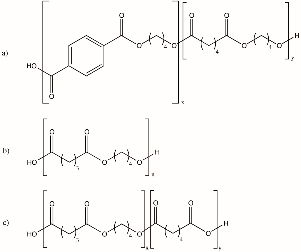 Chemical structure of (a) poly(butylene-adipate-co-terephtalate) (PBAT); (b) poly(butylene succinate) (PBS); and (c) poly(butylene succinate-co-adipate) (PBSA).