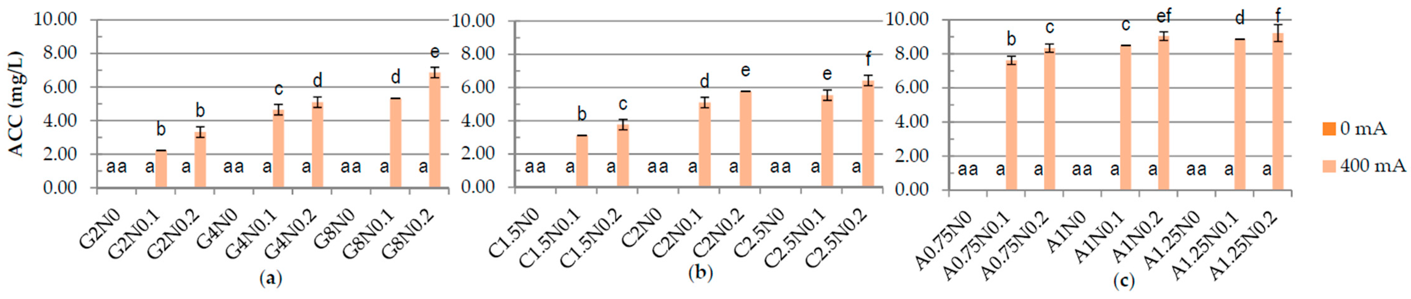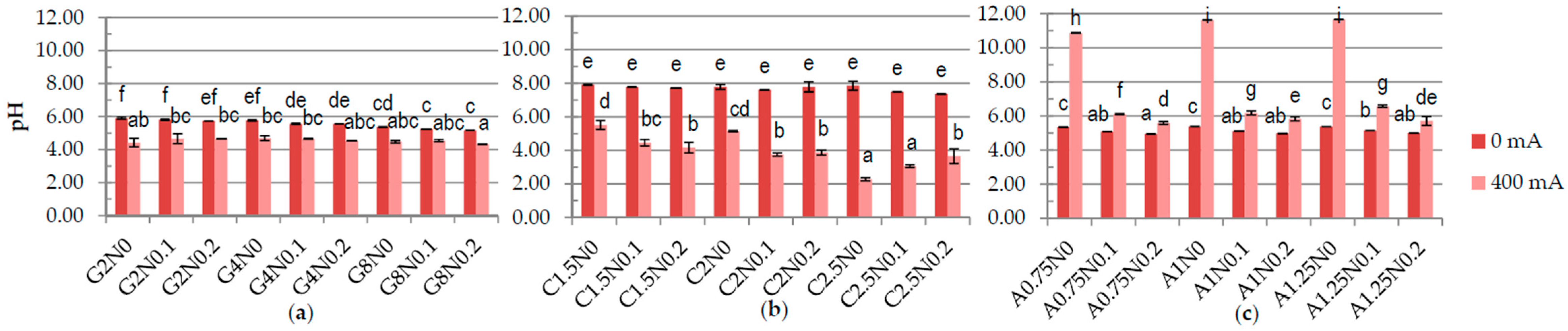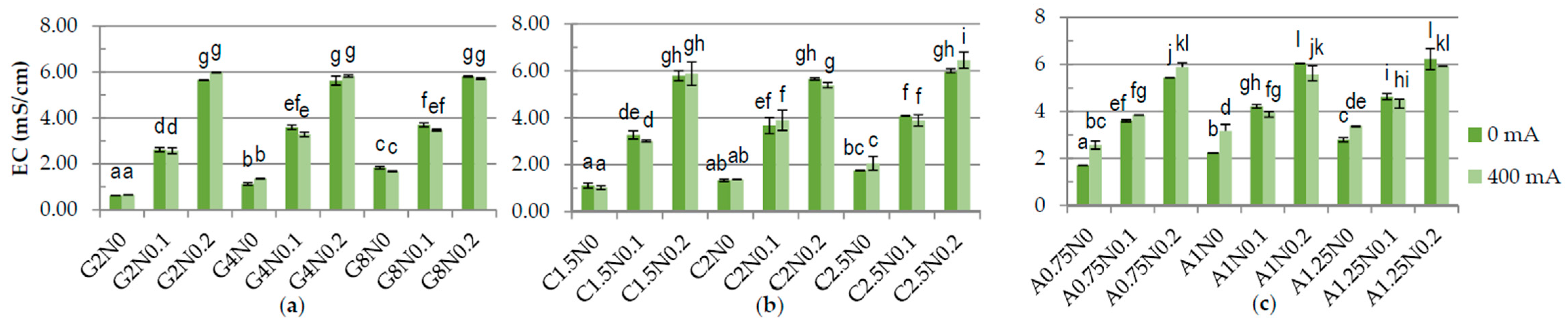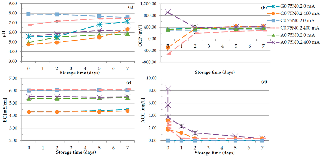 The EC of all samples remained constant during storage, whereas pH, ORP, and ACC changed with storage time (Figure 5). The pH of most of all samples increased during storage. The highest increase of pH from 5.61 to 7.12 and from 4.75 to 6.33, was observed for G0.75N0.2 0 mA and G0.75N0.2 400 mA variant, respectively. The differences in the pH of the gelatine gels during storage were also reported by Król and Jarmoluk [23]. There were no significant differences in the ORP before and after seven days of storage in the variants not treated with DC. After two days of storage, the ORP of gelatine, carrageenan and sodium alginate samples treated with 400 mA changed to the values approximating the value reading for samples not treated with DC. In the second day of storage, the ORP values decreased from 913.75 to 391.7 for A0.75N0.2 400 mA variant. The higher ORP values were noticed for G0.75N0.2 and for C0.75N0.2 treated with DC and it increased from −296.65 mV to 391.70 mV for gelatine and from −523.75 mV to 193.80 mV for carrageenan sample. A similar result has been observed by Cui et al. [31] for the change of ORP values in water. The authors suggest that increase and reaching an equilibrium ORP value around 750 mV can occur because the ORP values of electrolyzed water samples below 750 mV have reducing power and tend to react with oxidized species. The oxidation of low ORP water leads to increase in ORP. These may proceed slowly because water does not contain many reducing species before and after electrolysis. Figure 5d shows that ACC of all samples greatly decreased with storage time. There was 96% decrease in ACC of sodium alginate samples after seven days of storage. However, ACC of gelatine and carrageenan decreased by approximately 89% and 88%, respectively, after two days, but reached level maintained during storage. Cui et al. [31] concluded that electrolyzed water stored in open condition had greater loss of ACC compared to storage in closed condition. According to Len et al. [38], under open condition, the loss of chlorine by evaporation in AEW followed the first-order kinetics, which is not the case under closed conditions.
