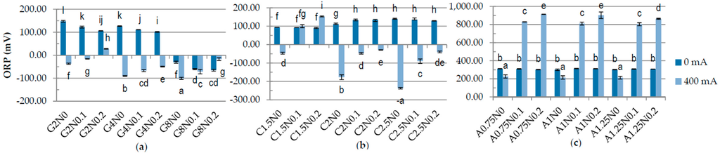 The effects of using DC on the oxidation-reduction potential (ORP) of: (a) gelatine; (b) carrageenan; and (c) sodium alginate hydrosols with different polymer and NaCl concentration. a–l Different letters indicate significantly different groups determined by Duncan’s test (p < 0.05).