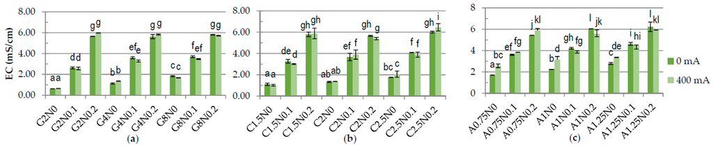 The effects of using DC on the electrical conductivity (EC): of (a) gelatine; (b) carrageenan; and (c) sodium alginate hydrosols with different polymer and NaCl concentration. a–l Different letters indicate significantly different groups determined by Duncan’s test (p < 0.05).