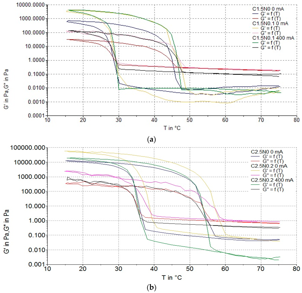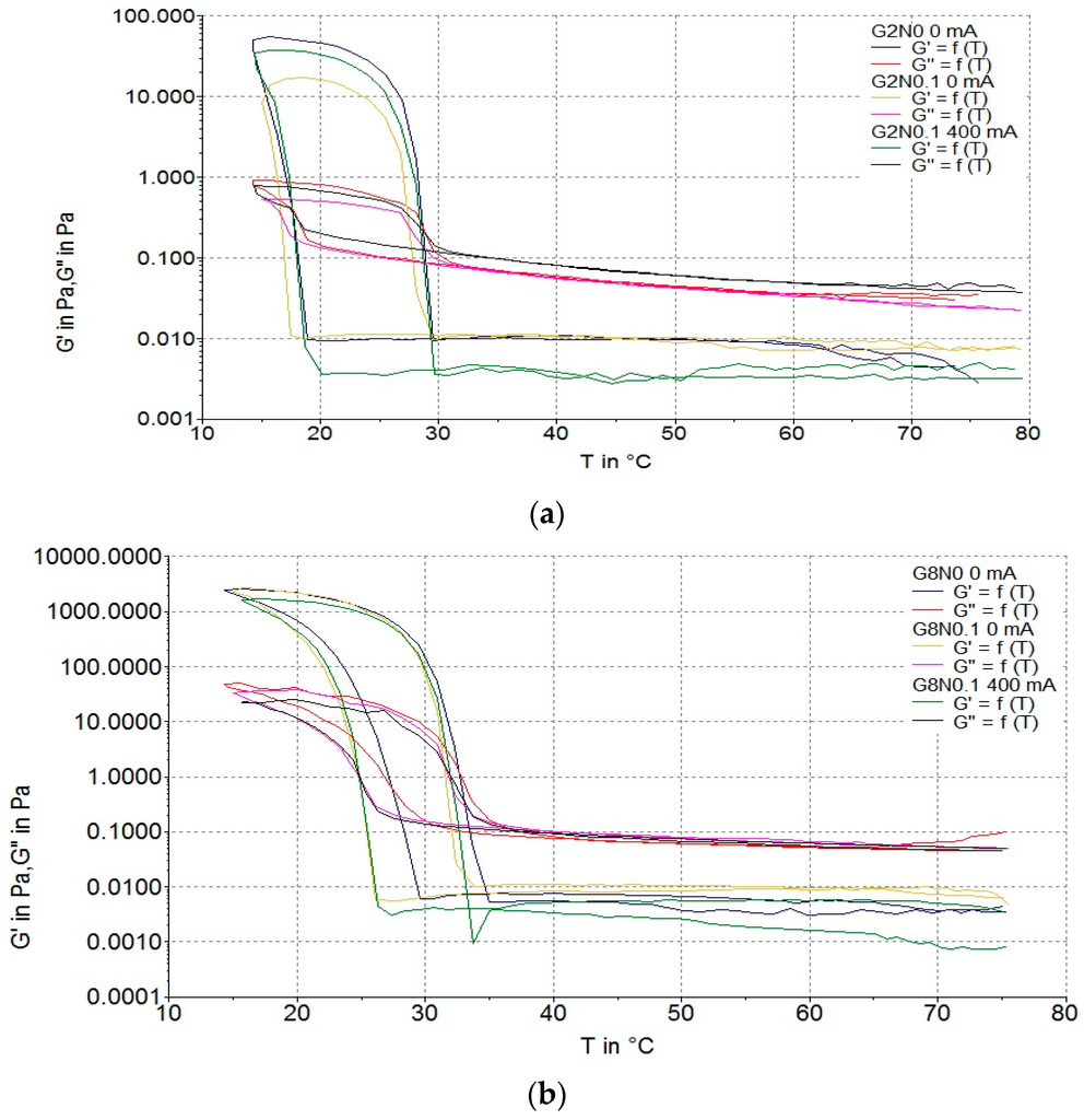 Figure 6 and Figure 7 show representative rheological results for gelatine and carrageenan hydrosols. There were no significant differences between the gelation temperature (Tg) in the gelatine hydrosols treated and not treated with DC. The lowest Tg was measured for samples with 2.0% gelatine (17.2–17.4 °C), while the highest was observed for G8N0.1 variant (27.4 °C). Similar results were observed for carrageenan samples. The lowest Tg was measured for C1.5N0 variant not treated with DC (28.2 °C) and the highest Tg was observed for C2.5N0.2 sample not treated with DC (39.0 °C). These results indicate that the higher the concentration of polymer, the higher the Tg of the hydrosols. This theory is confirmed by Pang et al. [44]. In their study, Tg of the gelatine gel ranged from 15 to 18 °C at 2.5% to 20–22 °C at 5.0% concentration. In accordance with Brychcy et al. [30], we observed that increasing of NaCl concentration causes higher Tg of carrageenan hydrosols. Increasing the addition of sodium chloride concentration decreased the electrostatic interaction allowing the triple helix constituents of the gel to freely reorganize in the medium to maximize the entropy which affects the Tg of the hydrosols [48].