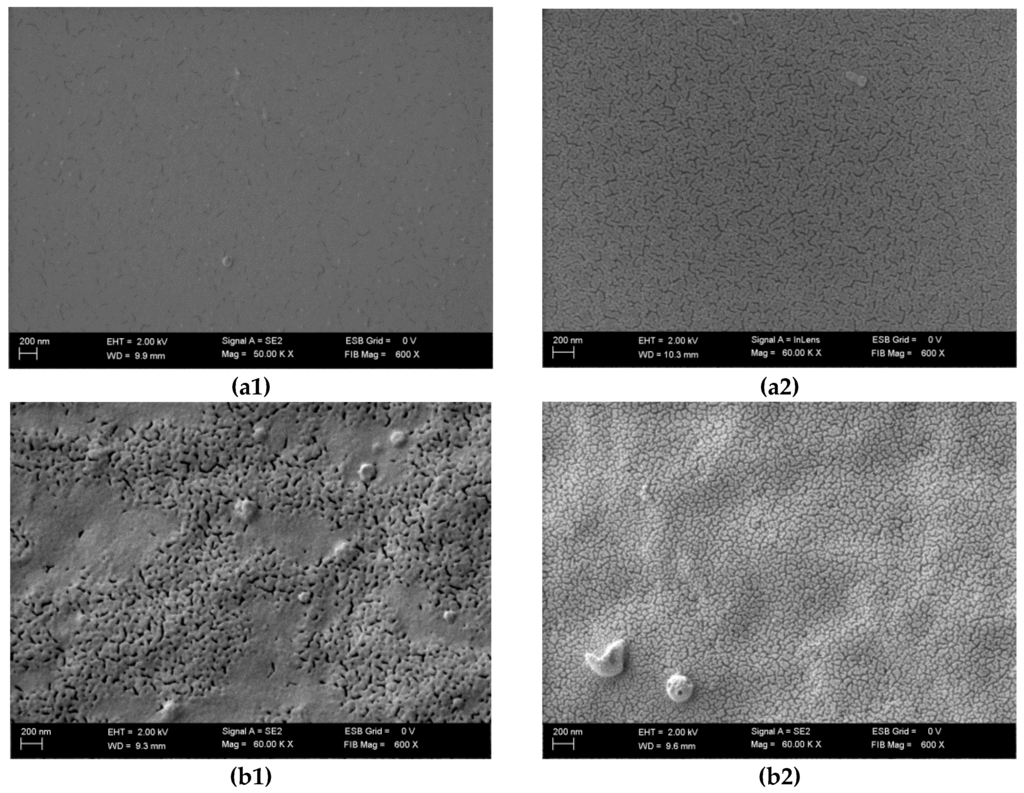 SEM images of the surface of hydrosols of: gelatine (a1) G8N0.2, 0 mA, (a2) G8N0.2, 400 mA; carrageenan (b1) C2.5N0.2, 0 mA, (b2) C2.5N0.2, 400 mA; and sodium alginate (c1) A1.25N0.2, 0 mA, (c2) A1.25N0.2, 400 mA.