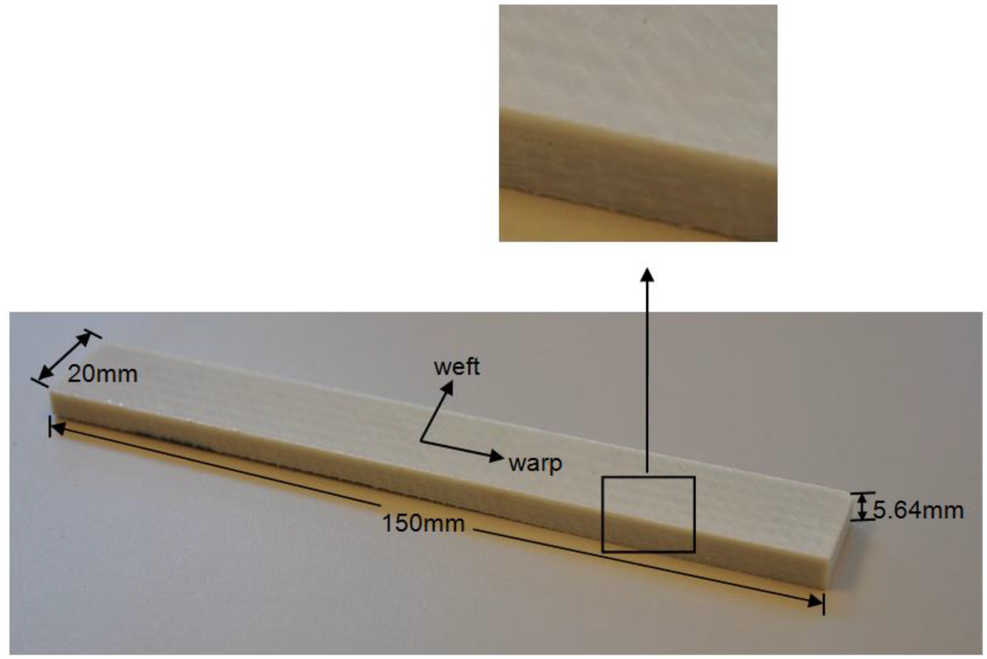 To investigate the flexural property of GFRP laminates, three-point bending tests were employed. The whole test procedure follows the test code ASTM D790-10 [27]. GFRP laminates studied in this paper were manufactured by resin vacuum infusion (Infra Composite BV, Delft, the Netherlands) using polyester, and then cut into specific dimensions with the principal axis parallel to the warp direction of the woven roving (as shown in Figure 1). The glass transition temperature (Tg) of GFRP laminates is 78 °C. The 5.64 mm thick specimen is composed of six layers of standard 0.94 mm EQX1200. The layup configuration of each piece of the standard 0.94 mm EQX1200 is illustrated in Table 1. The mechanical properties of GFRP laminates supplied by the manufacturer are shown in Table 2. The nominal length and width of the specimens were selected to be 150 and 20 mm respectively. According to the test code ASTM D790-10 [27], the specimen length shall be sufficient to allow for overhanging on each end of at least 10% of the support span. The specimen width shall not exceed one fourth of the support span for specimens greater than 3.2 mm in depth.