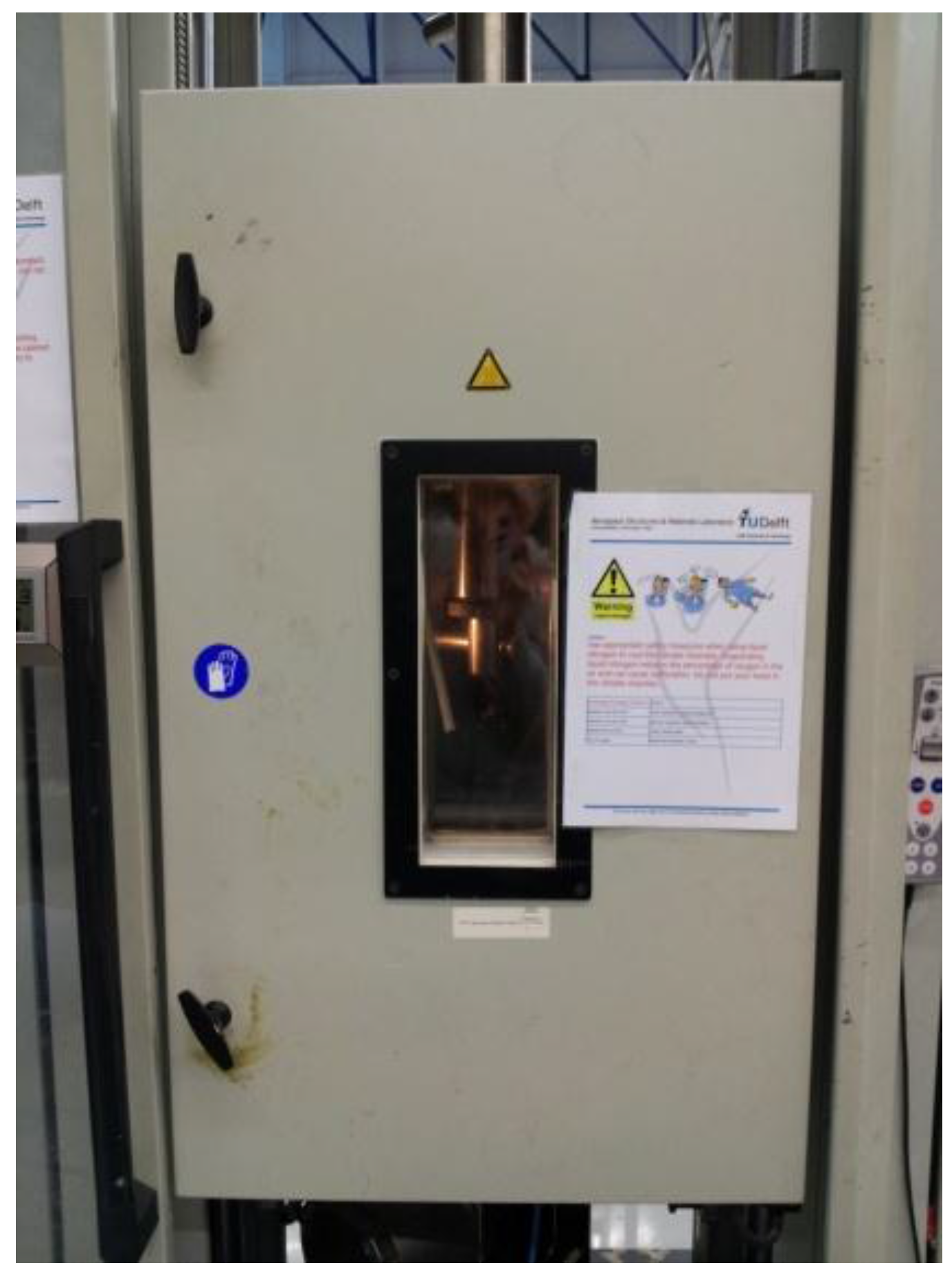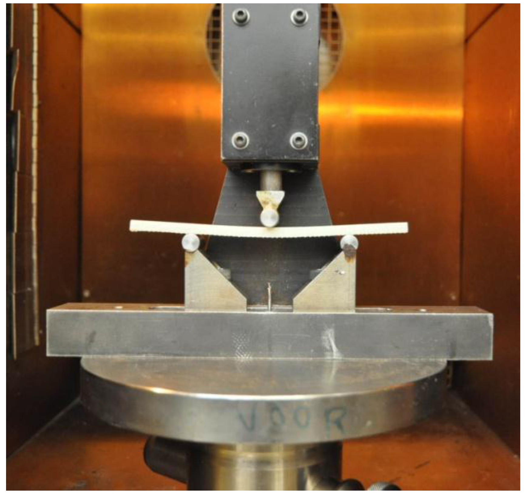 As shown in Figure 3, the whole three-point bending test set-up was put into the chamber. According to ASTM D790-10 [27], the support span-to-depth ratio is 16:1. Thus, the support span was proposed to be 90.24 mm, but it varied between different groups of specimens, since the value of the support span was exactly calculated based on the average real thickness of each group of specimens. The radii of the loading nose and supports were 5.0 ± 0.1 mm. The specimens were loaded at the strain rate 0.01 mm/mm/min. Correspondingly, the rate of crosshead motion was 2.4 mm/min, which is calculated as follows [27]: