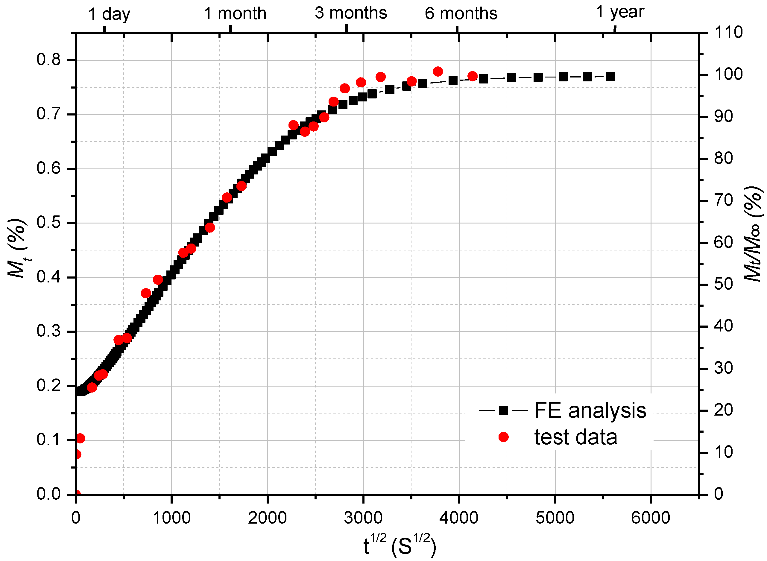 Moisture content is established as the function of the square root of time. It can be found that the moisture saturation level (M∞) is about 0.77%, which is in line with the gravimetric experimental results obtained in the previous research [28]. The specimens developed a similar moisture diffusion curve as that simulated by the FE analysis [28], which verifies the accuracy of the FE moisture diffusion model.