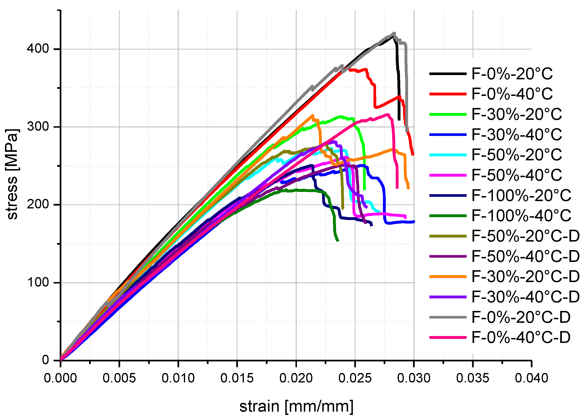 The stress-strain curves are presented in Figure 7. To make the comparison more clear, the curve of only one specimen under each test condition is presented, which was selected visually as the average curve of the five specimens.