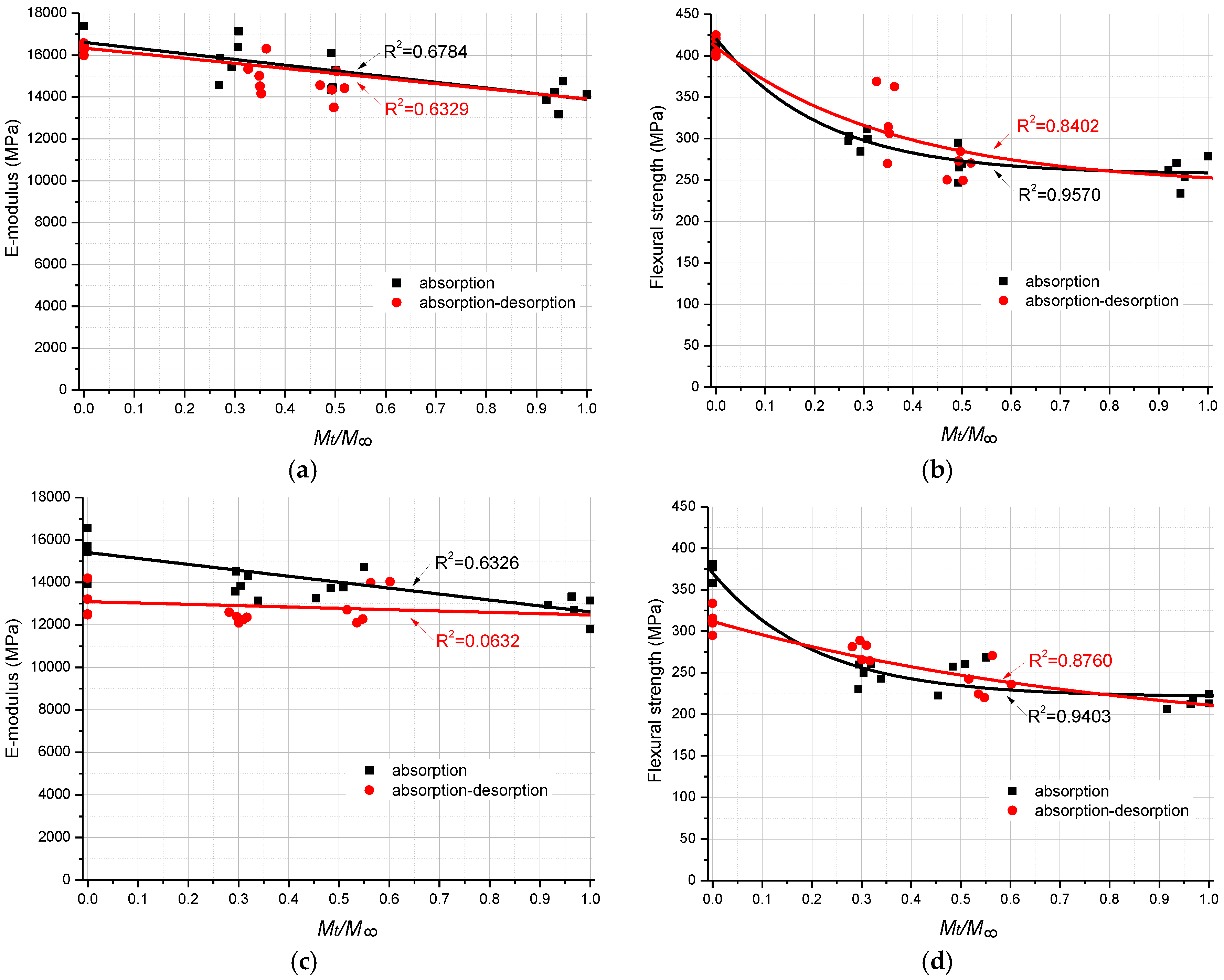 The flexural strength is the maximum flexural stress sustained by the test specimen during the flexural test. The environment-dependent flexural properties (including E-modulus and strength) are shown in Figure 8 and Table 4. The R-square value for each curve is also present in Figure 8, which indicates how well the curve fits test data points.