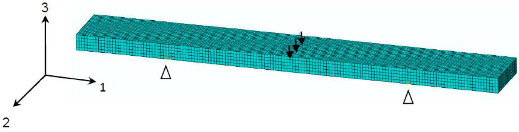 To develop the coupled hygro-mechanical FE modeling method, the FE model of the GFRP flexural test specimen was calibrated (as shown in Figure 9). The moisture diffusion process in the FRP specimen was modeled by the transient diffusion FE analysis (thoroughly described in previous research [28]) and validated by comparing with the gravimetric experimental results, as shown in Figure 5. From the moisture diffusion analysis, the moisture concentration distribution across the FRP specimen section was obtained as a function of time, which can be read into the stress analysis as a predefined field variable. The predictive equations (Equations (6), (7), (10) and (11)) of environment-dependent material properties served as the input of field-dependent material properties of FRP composites, which was obtained by the flexural tests. Hence, the E-modulus of each element was determined by the local moisture concentration. Thus, the coupled hygro-mechanical FE modeling was realized on the flexural test specimen. Subsequently, it can be employed to simulate other material tests (such as short-beam shear tests) and FRP structures.