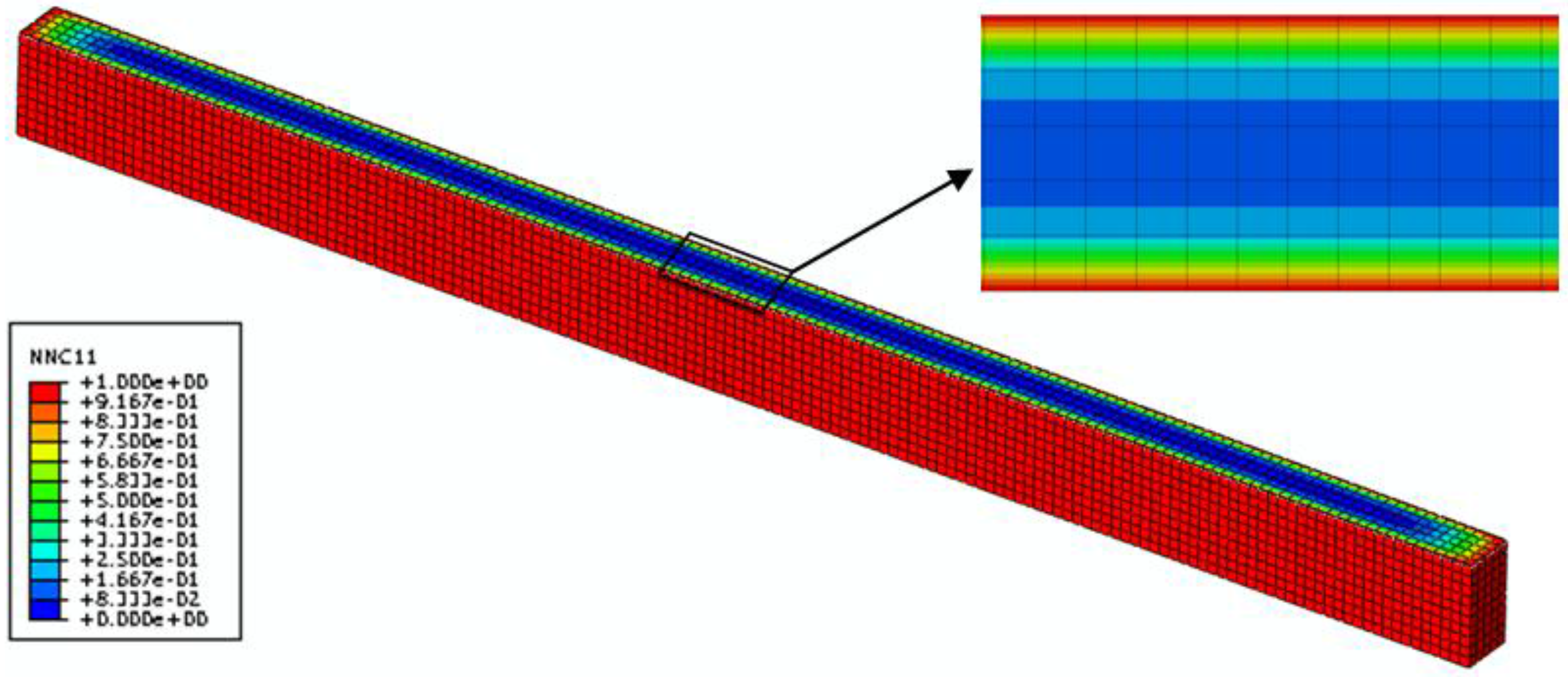 To validate this coupled hygro-mechanical FE modeling method, two groups of FRP specimens were selected: F-50%-20 °C and F-30%-40 °C-D. Firstly, the moisture concentration distributions throughout the mid-section of these two specimens are shown in Figure 10 and Figure 11. Based on these two predefined fields, the coupled hygro-mechanical FE analysis was executed. The FE stress analysis was linear-elastic. The element used was C3D8R, which is an 8-node linear brick element, with the capacity of reduced integration and hourglass control. In total 2000N load was applied at mid-span of the specimen.
