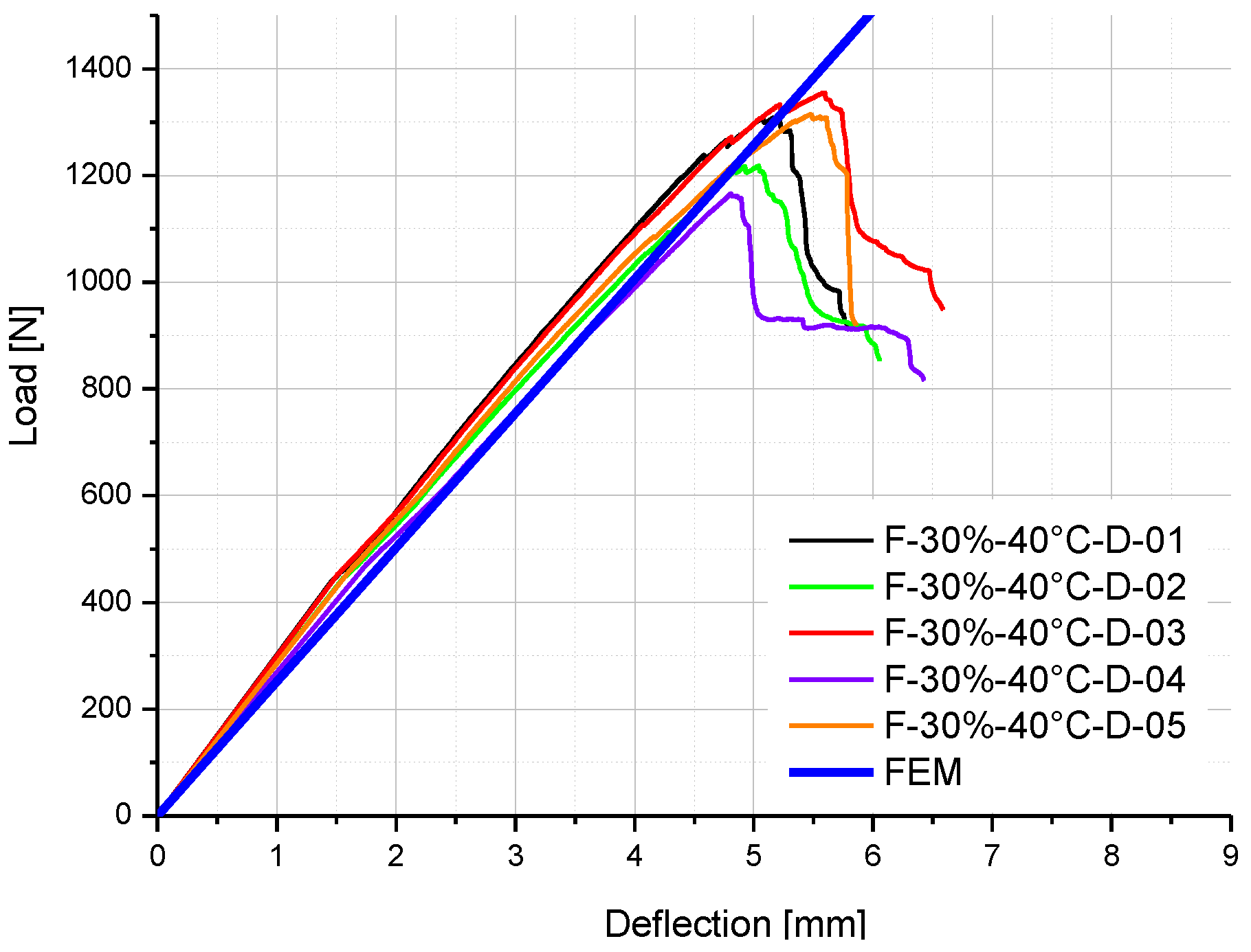 Comparison of experimental and FE results on the load-deflection curve of F-30%-40 °C-D specimens.