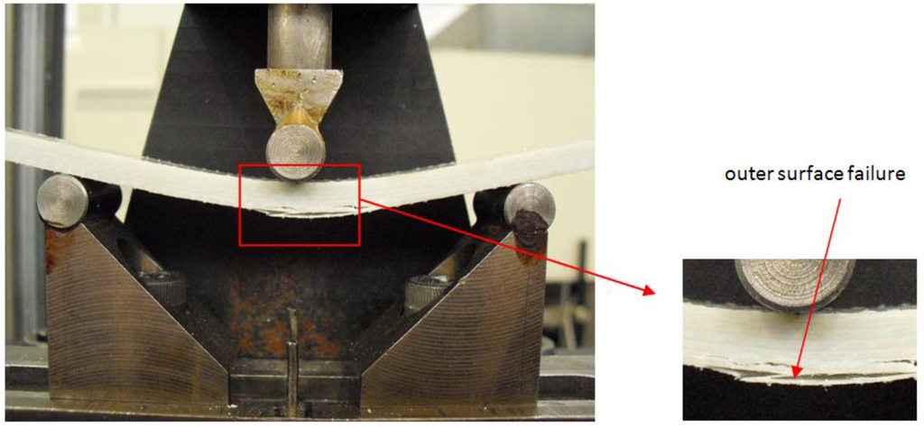 The typical failure mode of specimens under flexural tests is shown in Figure 6, where rupture occurs in the outer surface of the test specimen. In order to obtain the E-modulus of GFRP laminates, the stress and strain at the mid-span of GFRP specimens were calculated as follows.