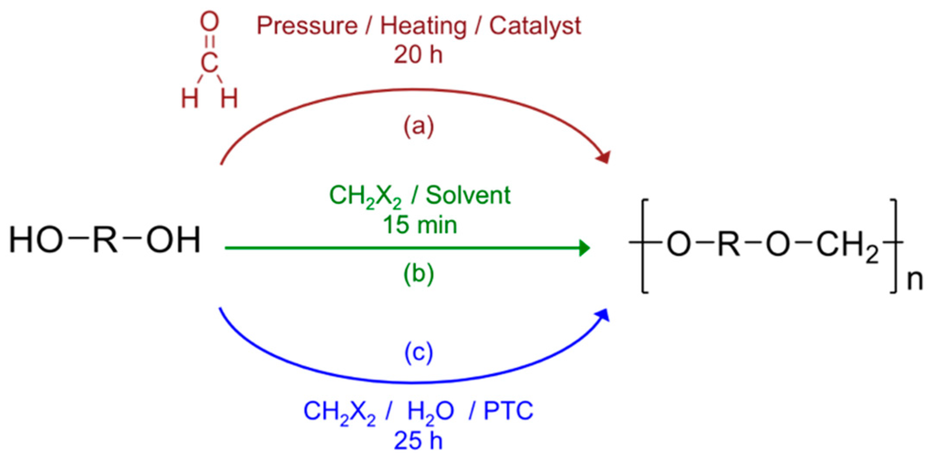 Different methods can be used to produce polyacetals. In the case of aliphatic polyacetals, the reaction can be directly performed between aliphatic diols [1,2,13] with formaldehyde or dialkyl formals (route (a)—Figure 1). However, when the diol contains less than 4 carbon atoms, the formation of cyclic structures is favored at the expense of linear macromolecular chains [14]. This chemical approach is not possible in the case of aromatic polyacetals. Indeed, it is well known that the reaction between aromatic diols (i.e., bisphenols) and formaldehyde leads to phenol-formaldehyde resins due to C-alkylation of the phenol instead of the wished O-alkylation [15,16,17,18]. As a consequence, the formal linkage must be produced according to another procedure. One possibility is offered by the mixture and reaction of the bisphenol with methylene halide in a water-immiscible non-polar aprotic solvent in alkaline conditions and in the presence of a phase-transfer catalyst (PTC) such as phosphonium or quaternary ammonium salts (route (c)) [19,20]. The formation of cyclic polyacetals remains possible but seems to be dependent on the experimental conditions such as the reaction temperature or the pressure [5].