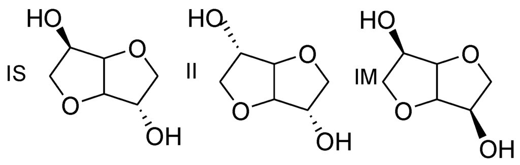 Chemical structures of dianhydrohexitols: isosorbide (IS), isoidide (II) and isomannide (IM).