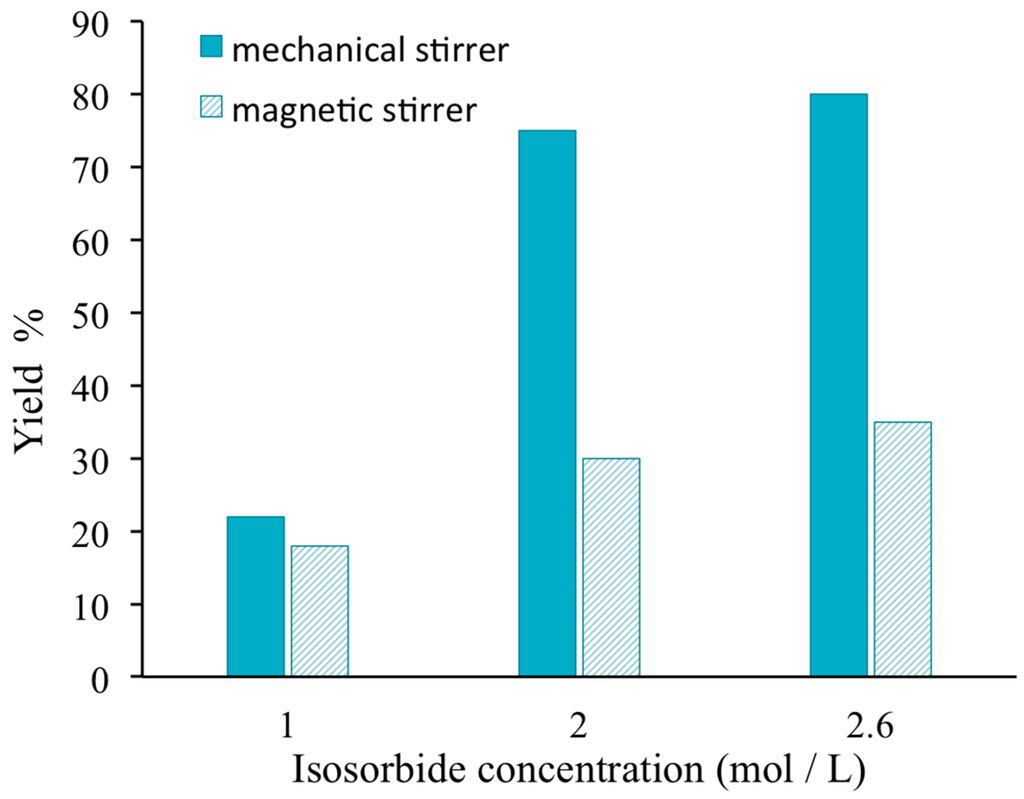 Figure 3 shows that whatever the initial concentration of isosorbide, the yield reaction is always higher when a mechanical stirrer is used for the mixing of the reactive solution instead of magnetic stirring. The discrepancy between both kinds of stirring is quite important for the highest concentrations due to the mixing difficulty when using a simple magnetic stirring.