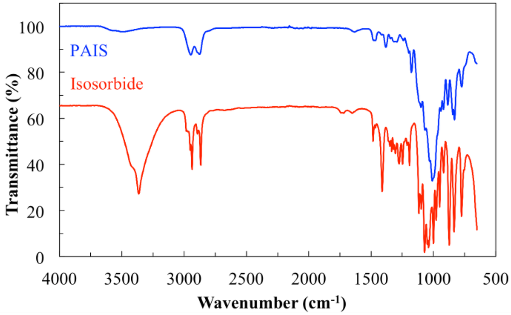 The first experiment consisted of the FT-IR characterization of PolyAcetalIsoSorbide (PAIS) polymer obtained by the high-speed stirring method. The resulting spectrum is shown in Figure 4. For clarity, the FT-IR data specific of isosorbide (IS) are also given for better discussion. The comparison of both spectra clearly shows that the PAIS chemical skeleton is based on isosorbide building block as expected. Indeed, PAIS spectrum includes the main bands of the signal characteristic of the IS compound.
