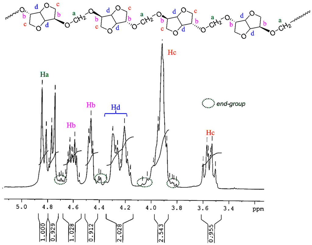 The chemical structure of PAIS produced from high stirring method was investigated by 1H NMR technique. The corresponding spectrum is shown in Figure 6. Its integrations agree with the expected structure. Indeed, the 1H NMR spectrum of polyacetals exhibits the signals characteristic of the protons present in monomeric structures (a–d). The isosorbide end groups can also be distinguished in Figure 6 by ellipsoidal forms with dot lines.