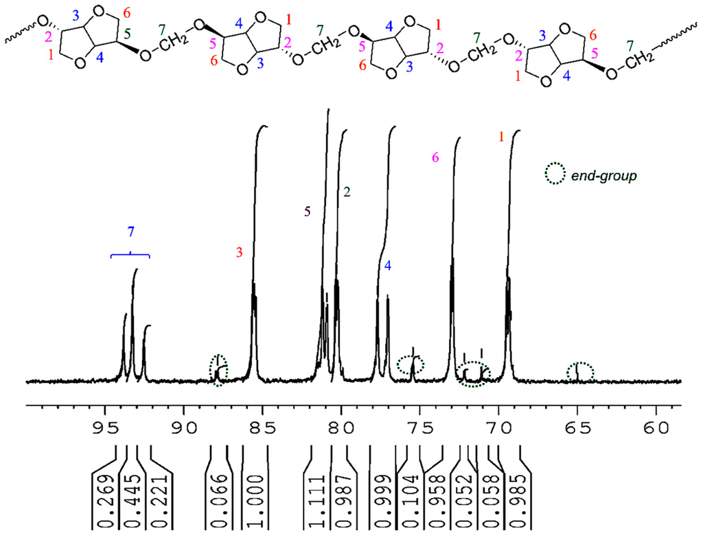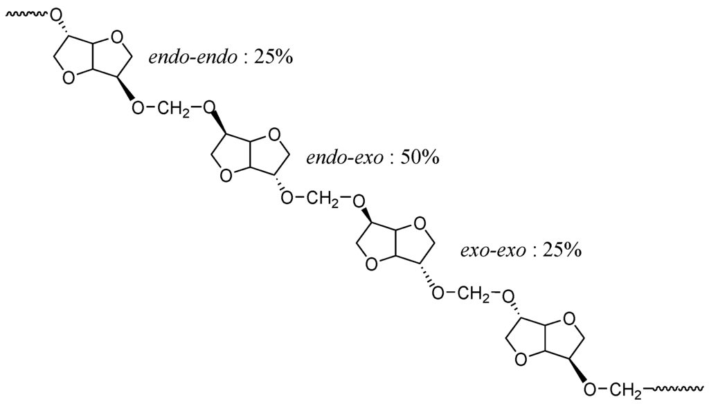 This signal pattern results from a random sequence of exo-exo (25%), endo-exo (50%) and endo-endo (25%) connected methylene groups respectively, as shown in Figure 8. These results are supported by previous data reported in literature with polycarbonates of isosorbide [50,53].