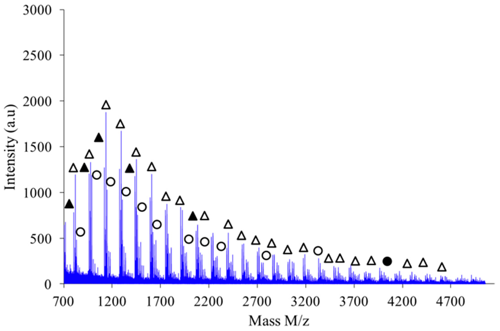 MALDI-TOF mass spectrum of PAIS (C = 2 M) prepared under high intensity mixing. Linear chains cationized with K+ or Na+ are represented by △ and ▲ symbols, respectively. Cyclic species cationized with K+ or Na+ are depicted by Ο and ●, respectively.