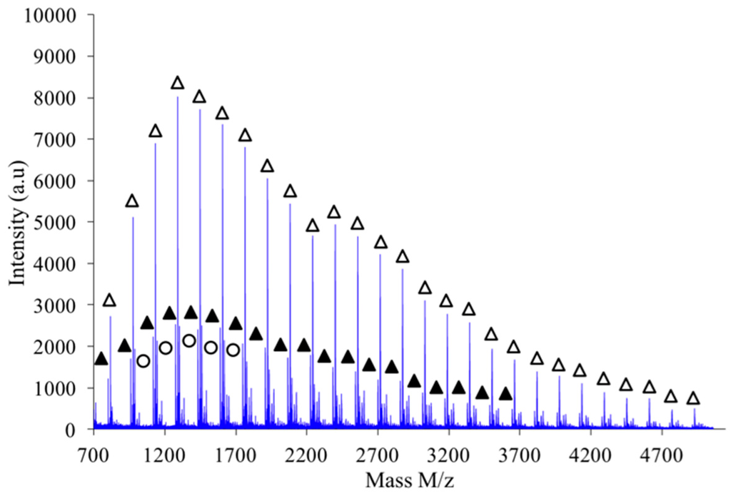 MALDI-TOF mass spectrum of PAIS (C = 1 M) prepared under magnetic mixing. Linear chains are represented by triangular symbols (△) while cyclic species are characterized by circular symbols (Ο), both cationized with K+ respectively.