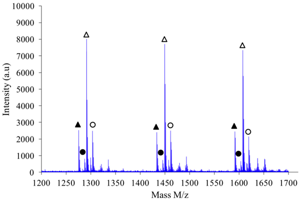 If a focus is made for instance in the m/z scale ranging from 1200 to 1700 as shown in Figure 11, one notices that the expected hierarchy between cationized species, as introduced before, is checked. Indeed, considering growing m/z values the peaks appear according to the following hierarchy: Na+Ln, Na+–Cn’, K+–Ln and finally K+–Cn’ in which n’ = n+1. Similar classification was obtained with the other synthesis conditions previously described.