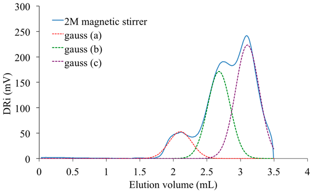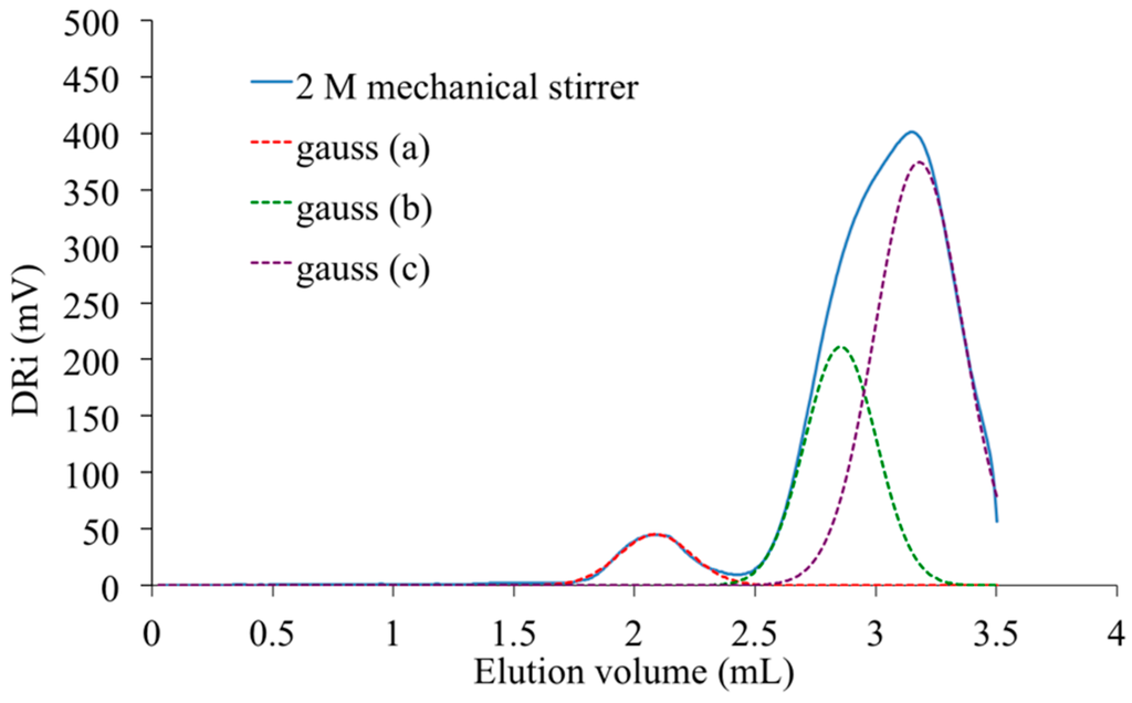 SEC experiments were performed to evaluate the molar weight distributions characteristic of different grades of PAIS, that is to say, obtained with different synthesis conditions. Figure 13 proposes as an example, the analysis registered with the PAIS prepared with a constant initial concentration of isosorbide (C = 2 M) and under magnetic stirring. The resulting SEC curve seems to be made of three principal peaks that can be distinguished using a deconvolution program based on Gaussian distribution. The corresponding material is made by chemical species with very different molecular weights.