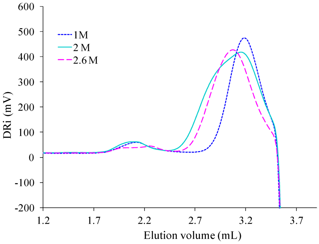 Its analysis after deconvolution confirms the different attributions of the peaks that were proposed here above. Indeed, the lowest concentration (C = 1 M) induced the production of small macromolecular chains characterized by the presence of a peak at highest elution volume (Figure 16). At this concentration, some cyclic structures with high molecular weight are also detected by the existence of a small peak centered at 2.1 mL. The peak characteristic of medium size chains is almost absent. For C = 2 M, the SEC signal still shows the same peaks. But, as said before, it also presents a shoulder representative of linear chains with medium molecular weight (Figure 14). At the highest concentration used for PAIS synthesis (C = 2.6 M), the complete SEC signal is shifted to lower elution volume revealing the production of linear polymeric chains of higher molar mass (Figure 16). Moreover, the peak that is specific of cyclic chains with high molar mass (2.0 mL) presents quite a reduced amplitude and a little one that is likely due to linear chains of bigger size and is noted at 2.3 mL.