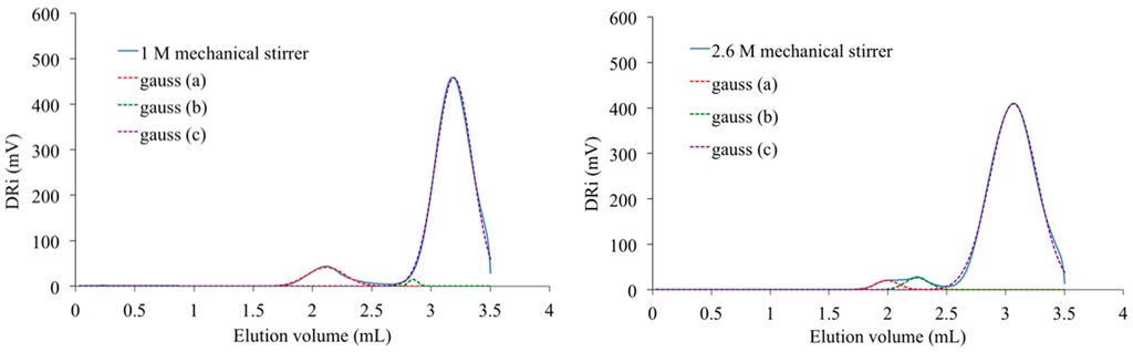Deconvolution of SEC analyses of PAIS prepared with C = 1 M (left) and C = 2.6 M (right).