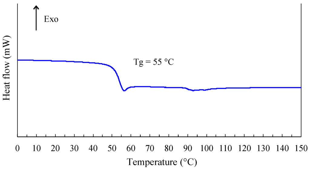 Different physicochemical analyses experiments were performed to evaluate the macroscopic properties of linear polyacetals derived from the reaction between isosorbide and methylene chloride. First experiments were conducted using DSC technique in dynamic mode. The corresponding thermogram presented in Figure 17, only shows a discontinuity in the whole temperature range investigated. Moreover, the registering of the DSC signal during cooling does not show any crystallization. Such information reveals that our polyacetal is an amorphous polymer. Please note that the experimental conditions used cannot be considered as responsible for this characteristic. The glass transition temperature evaluated at the middle of the signal discontinuity is about 55 °C. This morphology is likely due to the asymmetry of hydroxyl groups in isosorbide. In other words, the respective positions of endo and exo hydroxyl groups induce the formation of stereo irregular polymer. The presence of a little endothermic zone can also be observed for T > 90 °C and is likely due to the departure (vaporization) of a quite reduced quantity of water trapped by the polymeric matrix. This hypothesis is supported by the fact that this phenomenon is not registered during a second run.