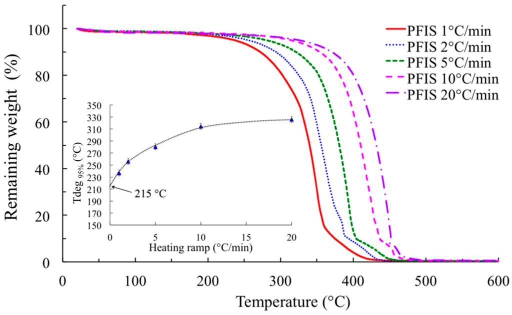 The thermostability of the same polymer was investigated using thermogravimetry in air atmosphere. The weight loss value of 5% was considered as reasonable to evaluate the onset of the PAIS thermal degradation. At the temperature ramp β of 10 °C·min−1 classically taken in TGA analyses, the temperature degradation Tdeg seems to be close to 314 °C for a weight loss of 5% (Figure 18). Actually, this latter value is strongly dependent on the heating rate used in the thermogravimetric analyses. A reduction of the temperature ramp β, synonym of a higher thermal stay of the sample in the oven, induces a shift of the “apparent” Tdeg to lower values. This evolution shows that the classical method based on an only experiment usually performed at 10 °C/min has no sense. Indeed, if the experiment is operated at lower heating ramp, the degradation occurs at lower temperature because the time factor has stronger influence. At the extreme limit, it should be better to perform the analysis at quite reduced heating ramp (i.e., 0.1 °C/min) to take into consideration both time and temperature effects on the degradation process. But, the corresponding experiment is quite long. Nevertheless, by extrapolating the curve of Tdeg = f(β) to β = 0, it is possible to evaluate the “real” thermal degradation temperature. Indeed, in these conditions, the degradation process fully takes into account the influence of both temperature and kinetic factors and consequently, the real degradation temperature Tdeg is about 215 °C (insert in Figure 18).