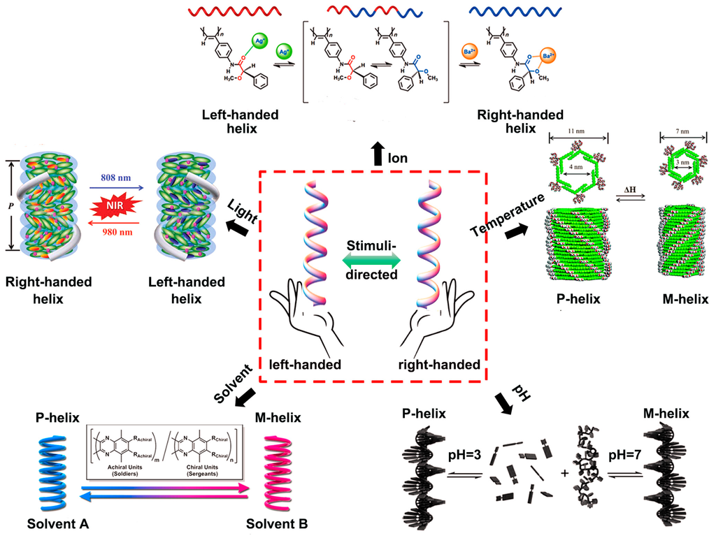 Schematic illustration of helical chirality inversion through different external stimuli, such as solvent, light irradiation, ion, temperature and pH. Typical examples for these modulate methods are also displayed. Reproduced from [,,,,] with copyright permission.