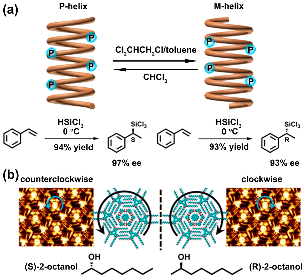 (a) Asymmetric hydrosilylation of styrenes using a PQXphos variant as ligand. Switching of enantioinduction in this reaction can be achieved by tuning the helix of the ligand via solvent stimuli; (b) DBA-OC10 can self-assemble into well-organized counterclockwise or clockwise nanopatterns at the (S)-2-octanol/highly oriented pyrolytic graphite (HOPG, left) and (R)-2-octanol/HOPG interface (right), respectively, observed by high resolution-scanning tunneling microscope (HR-STM). Reproduced from [] with copyright permission.