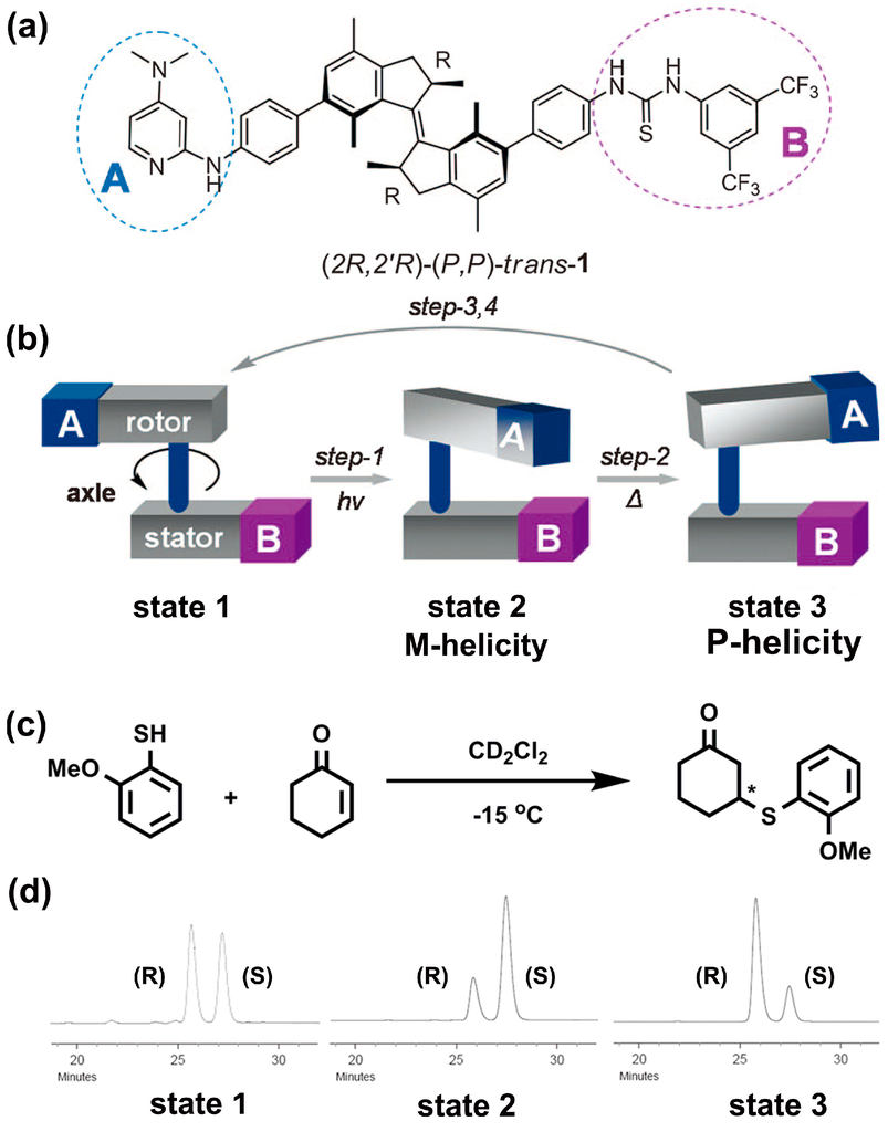 (a) Chemical structure of light-driven molecular motor; (b) Schematic illustration of one full rotary cycle by photo and thermally stimuli; (c) The catalytic reaction scheme and conditions; (d) HPLC traces of the reaction product utilizing catalyst in state 1 (S/R = 49/51), state 2 (S/R = 75/25) and state 3 (S/R = 23/77), respectively. Reproduced from [] with copyright permission.