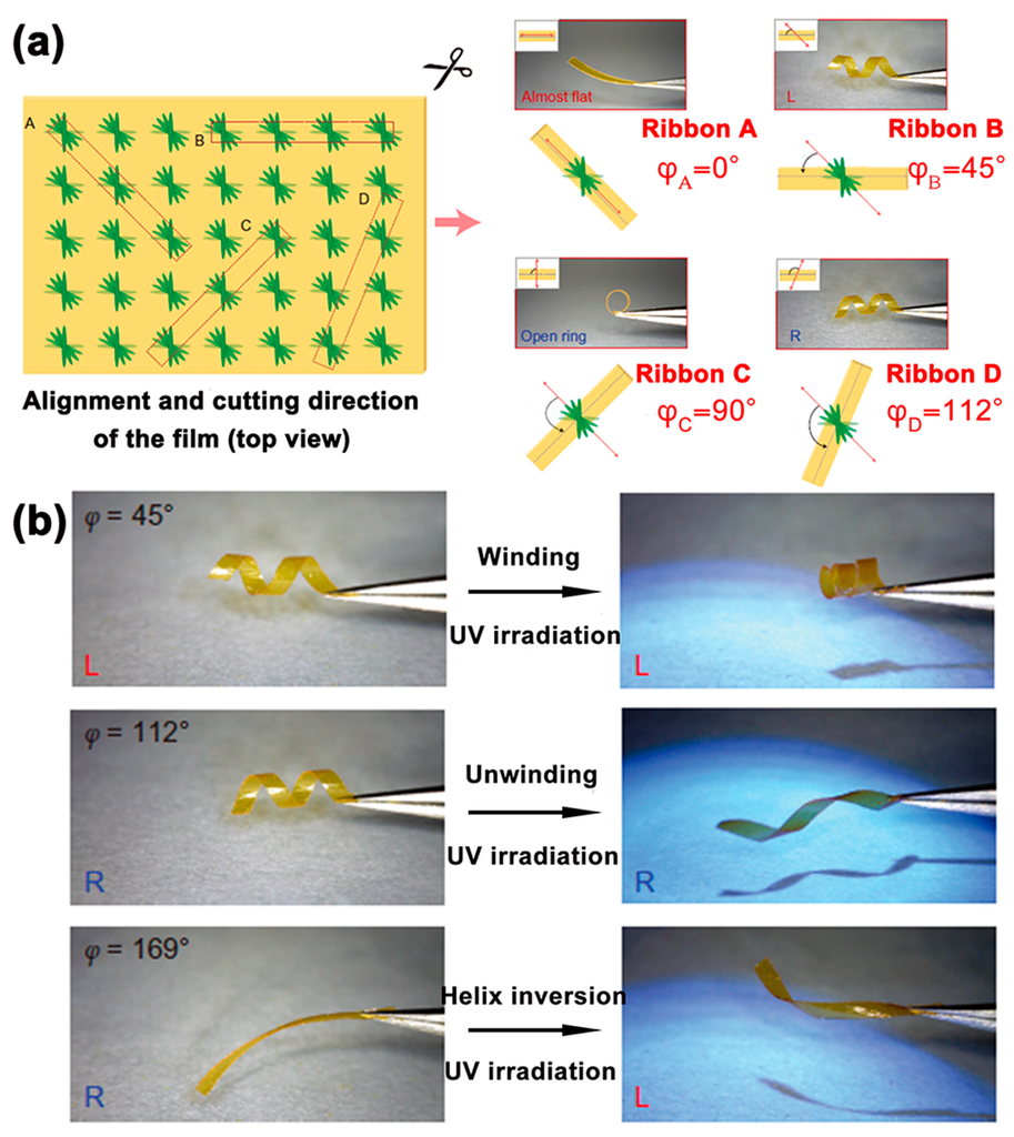 (a) Ribbons show distinct macroscopic shapes depending on the direction they are cut, ribbon A is almost flat, ribbon C exhibits an open-ring shape, ribbon B and D displayed left-handed or right-handed shape, respectively. (b) The mechanical motions (i.e., winding, unwinding, and helix inversion) can be observed by the naked eye via different ribbons triggered by UV light irradiation. Reproduced from [] with copyright permission.