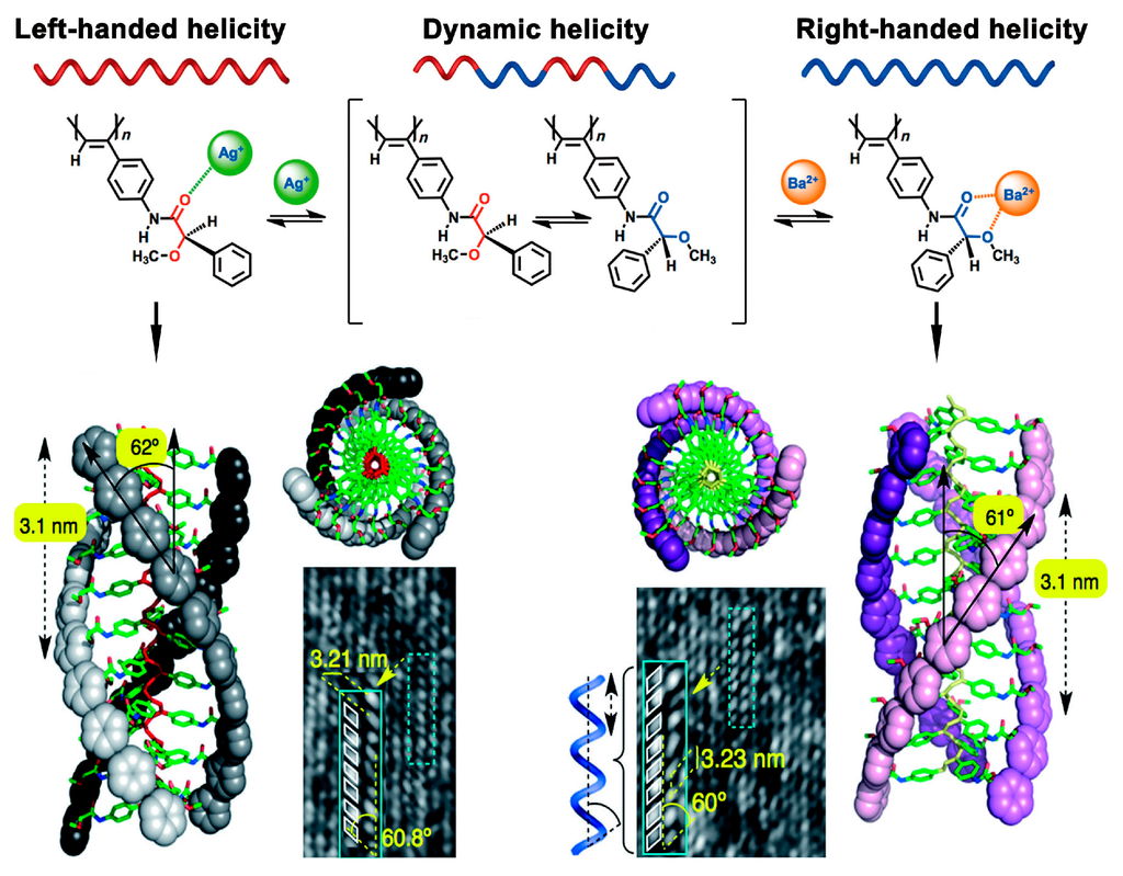 One of the most widely used methods for ion-directed conformational change is protonation, and a series of studies on cation-mediated chirality inversion have been reported. Riguera et al. performed a series of investigations on the construction of helical supramolecular assemblies from poly(phenylacetylene)s (PAAs). In 2010, the authors synthesized a PAA bearing phenylglycine methyl ester groups, induction and inversion of helical sense of this polymer could be achieved by choosing appropriate metal cation species as stimuli []. By analyzing the CD spectra of the polymer after the treatment of five perchlorates of mono- or divalent metal cations (i.e., Li+, Na+, Ag+, Mg2+ and Ba2+), the authors found that all of these cations could trigger the helical chirality inversion of this polymer, and Ba2+ generated the strongest effect. Subsequently, the authors prepared a PAA derivative bearing a chelating unit (α-methoxyphenylacetic acid). The authors investigated the influence of the addition of perchlorates of mono and divalent metal cations on the formation of helical senses of the polymer []. Without ion stimuli, the polymer was in a highly dynamic state, which contained both left-handed and right-handed assemblies without predominant helicity. Interestingly, the chiral side chains interacted with mono or divalent cations differently, which then induced left- or right-handed predominant helicity, respectively, as displayed in Figure 5. This phenomenon could be directly detected by AFM images of the polymer combined with Ba2+ or Ag+ on a highly oriented pyrolytic graphite surface. Hence, this polymer can be used as a novel sensor for the detection of mono and divalent cations. In 2014, the same group also realized the switching of the helical senses of a copolymer system by ion stimuli (i.e., Li+ and Ba2+) []. Interestingly, in 2015, the authors achieved selectively either left-handed helix or right-handed helix using only one ion (i.e., Na+) []. Recently, they advanced their research by preparing a highly dynamic poly(arylacetylene) system []. They found that the polymer could form helically controlled nanostructures (e.g., nanospheres, nanotubes, toroids) by interaction with ions (i.e., Li+, Na+, Ag+). With Ag+, the polymer preferred to form nanospheres with M helicity and tunable sizes. In contrast, with Li+ and Na+, the polymer preferred to yield nanotubes, gels or toroids with M helicity as well as encapsulating properties. Analogously, a similar work using metal ions to switch macroscopic chirality of chiral nanostructures has also been reported by the same group [].