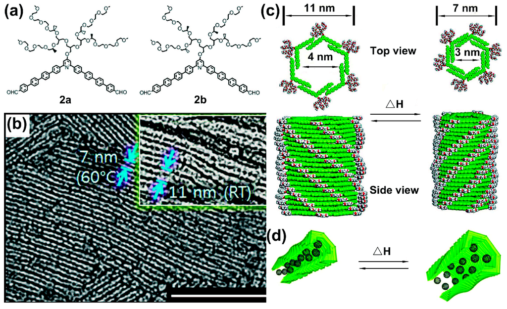 Yashima and coworkers reported a series of studies on chirality inversion of helical polymers (e.g., polyacetylene) through thermal stimulus. In 2005, they designed a cis-transoidal poly(phenylacetylene) bearing a bulky phenyl phosphonate group, which exhibited a dual memory of enantiomeric helices []. By addition of chiral additive, the polymer assembled into the preferred helical structure. Taking (R)-1-(1-naphthyl)ethylamine ((R)-2) as an example, the polymer preferred a left-handed helix upon combining with (R)-2 at 25 °C, whereas, it turned into a right-handed helix when the temperature was increased to 65 °C, indicated by the analysis of the CD spectra. In addition, the induced helical sense was “frozen” even after the removal of (R)-2. Later, the authors prepared a series of co-poly(phenylacetylene)s bearing optically active cyclodextrin (CyD) residues, including α-CyD, β-CyD, γ-CyD, and permethylated β-CyD (denoted as poly-1α, poly-2β, poly-3γ, and poly-2β-Me, respectively) []. Helical chirality inversions of these polymeric systems, together with obvious color changes of the corresponding solutions, were also achieved by other external stimuli, such as temperature, solvent or guest molecules (i.e., 1-phenylethylamine). More interestingly, in 2012, the authors designed novel supramolecular nanotubules, which experienced a reversible helical inversion along with contraction-expansion motions through thermal stimulus, as displayed in Figure 6 []. A pair of enantiomeric bent-shaped rod amphiphiles were prepared (Figure 6a, denoted 2a and 2b); 2a (0.02 wt % aqueous solution) formed elongated tubules with a uniform external diameter of approximately 11 nm and internal diameter of approximately 4 nm at room temperature, as observed in the TEM image (Figure 6b). In response to a thermal stimulus, adjacent aromatic segments underwent a remarkable slide, which then caused pulsating motions of the helical tubules accompanied by a helix inversion (Figure 6c). Moreover, due to the shrinkage and swelling of the tubules (Figure 6d), the thermo-induced dynamic motion of the tubules then led to the release of different amounts of encapsulated C60 guests.