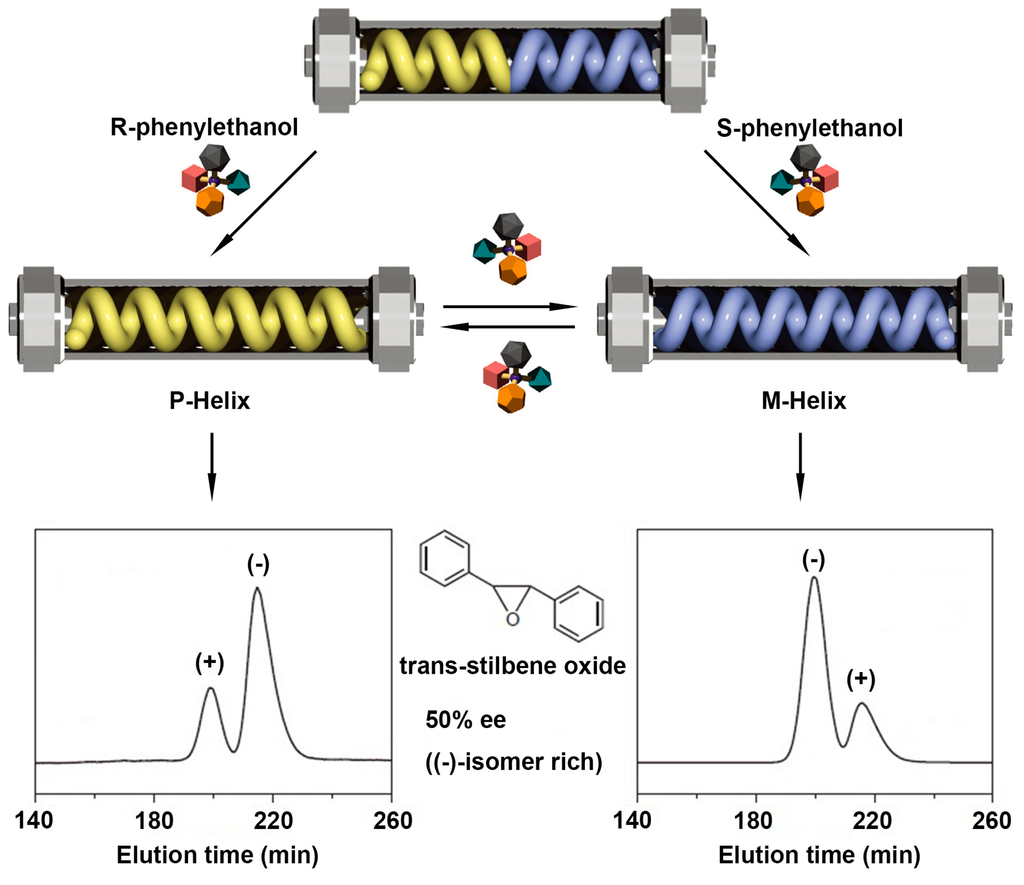 Schematic illustration of switchable enantioseparation (trans-stilbene oxide) by poly-1 stationary phase. Through R/S-phenylethanol stimulus, the original racemic helicity can turn into P-helix or M-helix, generating a great impact on the elution order of trans-stilbene oxide enantiomers. Reproduced from [] with copyright permission.